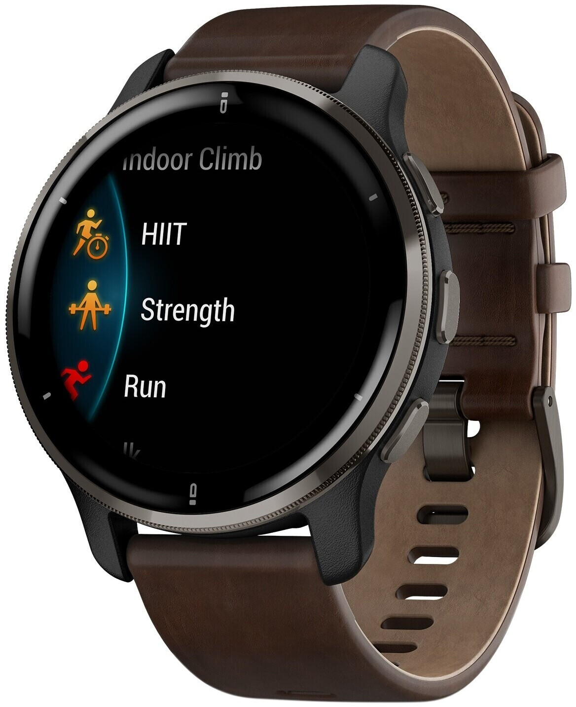 Mit einem Gehäusedurchmesser von 43 mm und einem Gewicht von nur 51 g ist die Garmin Venu 2 Plus angenehm leicht und lässt sich sowohl im Alltag als auch beim Sport gut tragen. Das Gehäuse besteht aus einer Kombination von Edelstahl und Polymer, was für Stabilität sorgt, während das 1,3 Zoll große AMOLED-Display mit einer Auflösung von 416 x 416 Pixel eine brillante Farbdarstellung bietet. Die Uhr ist in der Farbvariante Schiefergrau/Braunes Leder erhältlich und passt dank ihres schlichten Designs sowohl zu sportlicher als auch zu formeller Kleidung.