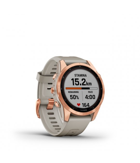 Die Garmin Fenix 7S Solar präsentiert sich in einem ansprechenden roségold/beigen Design und einem Polymergehäuse, das sowohl leicht als auch robust ist. Mit einem Durchmesser von 42 mm und einem Gewicht von nur 63 g liegt die Uhr angenehm am Handgelenk und eignet sich sowohl für den Alltag als auch für sportliche Aktivitäten. Das Silikonarmband sorgt für einen hohen Tragekomfort, auch während intensiver Trainingseinheiten.