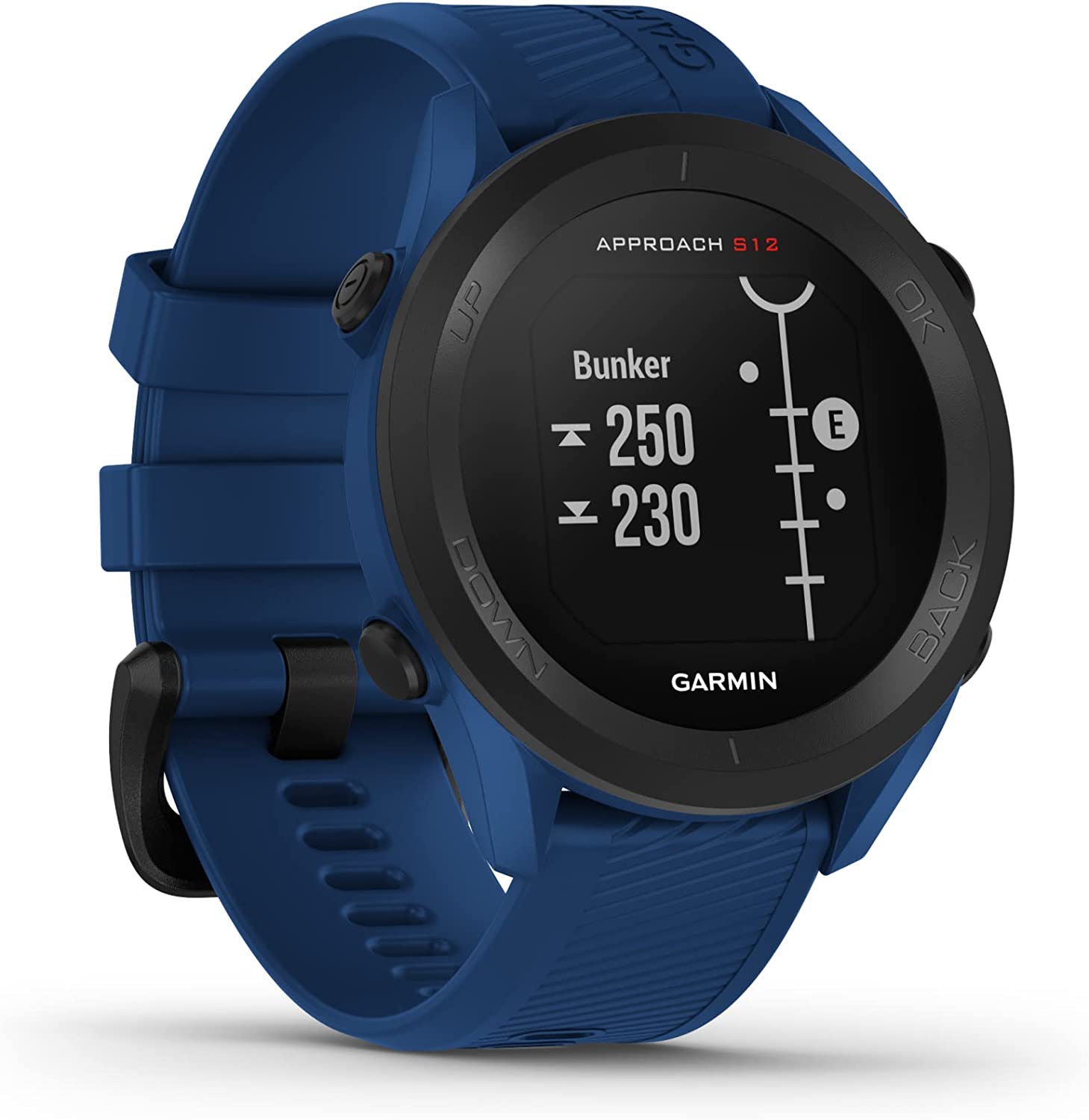 Die Garmin Approach S12 kommt in einem attraktiven dunkelblau/ schwarzen Design und hat ein 43,7 mm großes Kunststoffgehäuse, das mit einem Gewicht von nur 34,1 g für eine komfortable Trageweise sorgt. Das rund geformte Armband aus Silikon bietet nicht nur eine angenehme Passform, sondern ist auch für längere Tragezeiten ausgelegt. Zudem ist die Uhr wasserdicht bis 5 ATM, was sie für alle Wetterbedingungen geeignet macht. Das gut ablesbare Display erleichtert die Nutzung, selbst bei direkter Sonneneinstrahlung.