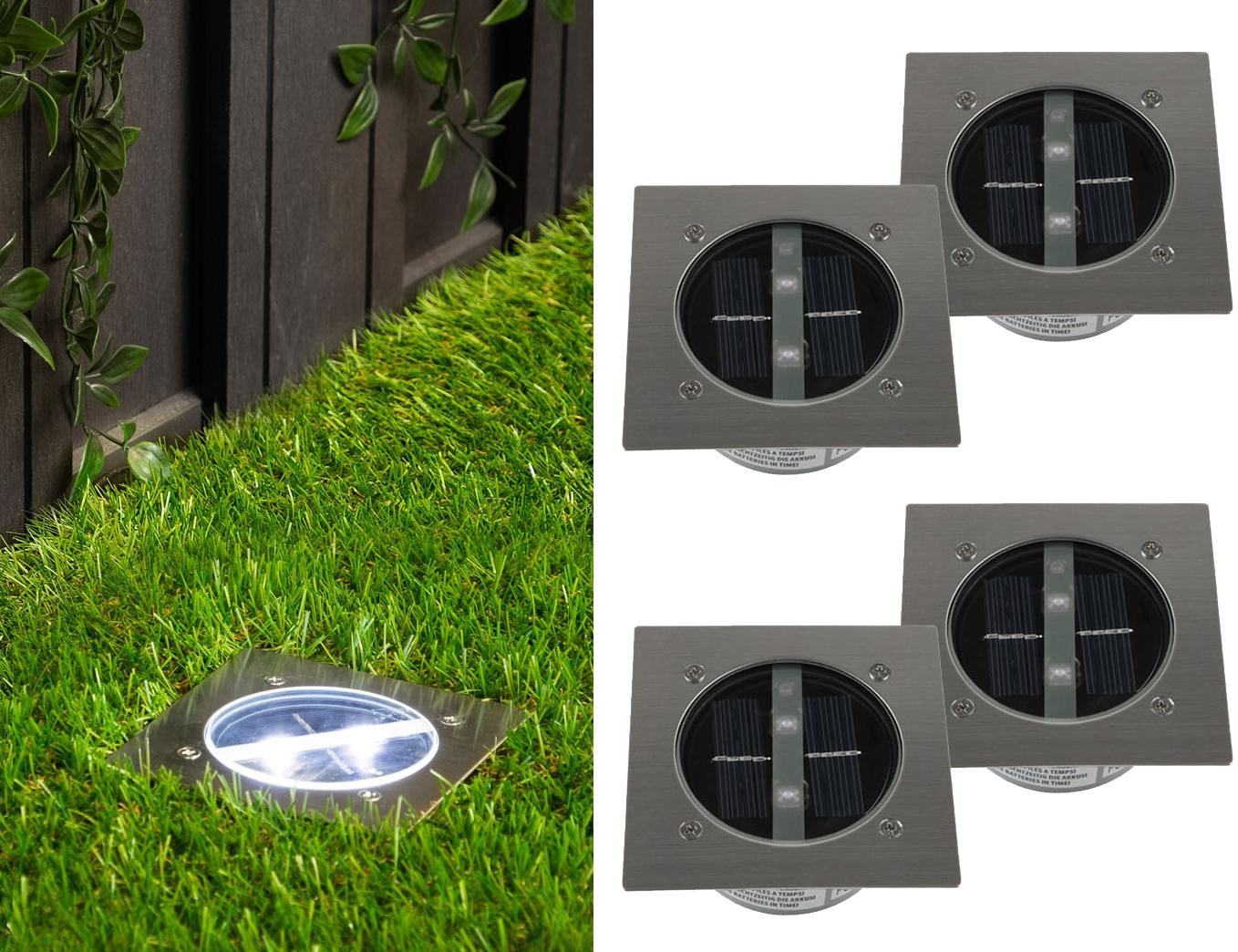 | Name | Solar LED Bodeneinbaustrahler 4er SET für Außen, Edelstahl 4-eckig 10x10cm, IP67 |