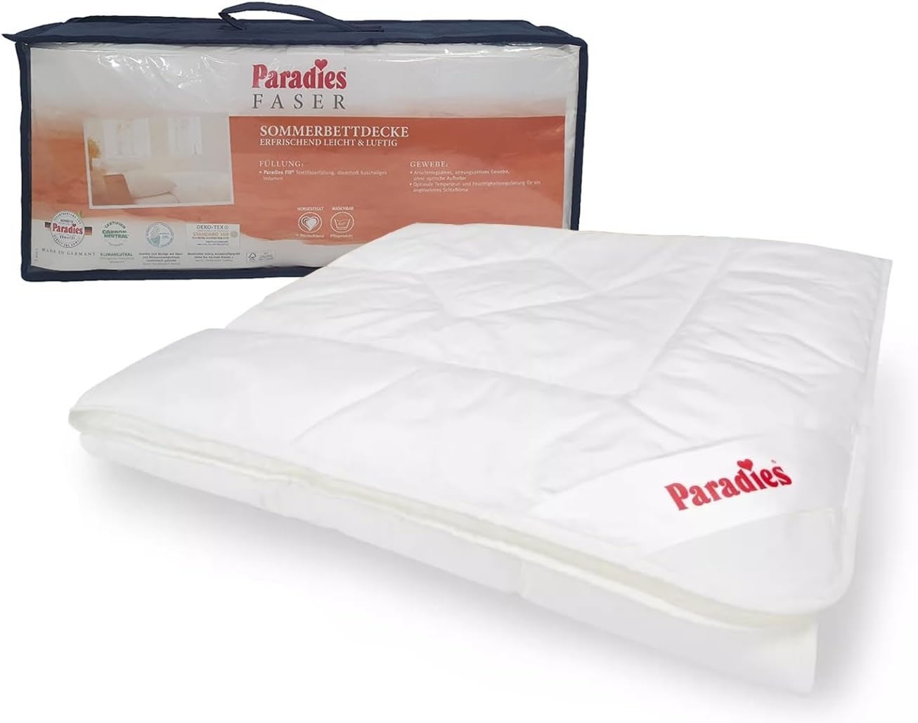 Die Paradies Sommerdecke Halia in der Größe 135 x 200 cm sorgt für ein gesundes Schlafklima und ist humanökologisch unbedenklich. Sie bietet ein maximales Volumen und ist ideal für warme Sommernächte. Die Decke besteht zu 100 % aus Baumwolle und ist sowohl trocknergeeignet als auch bei 60 Grad waschbar. Genießen Sie die kuschelige Leichtigkeit und den hohen Komfort dieser Sommerdecke. **Highlights** - Leichtes Sommerbett - Besonders kuschelig - Maximales Volumen **Produkteigenschaften** - Größe: 135 x 200 cm - Material: 100 % Baumwolle - Pflegehinweis: Trockner geeignet, waschbar bei 60 Grad - Bezug: 100 % Baumwolle - Füllung: 100 % Polyester - Wärmehaltung/-grad: 1 - Bezugsmaterial mit Aloe-Vera Gewebeveredelung - Geräuscharm für ungestörten Schlaf - Klimafaser-Füllung für individuelles Schlafklima