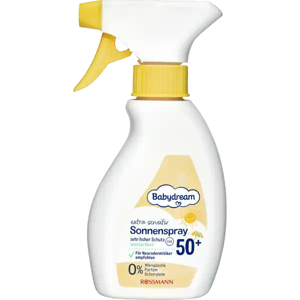 • Mit seiner Wasserfestigkeit schützt das Babydream Sonnenspray auch nach 40 Minuten im Wasser noch mit mindestens 50% seines angegebenen Lichtschutzfaktors.