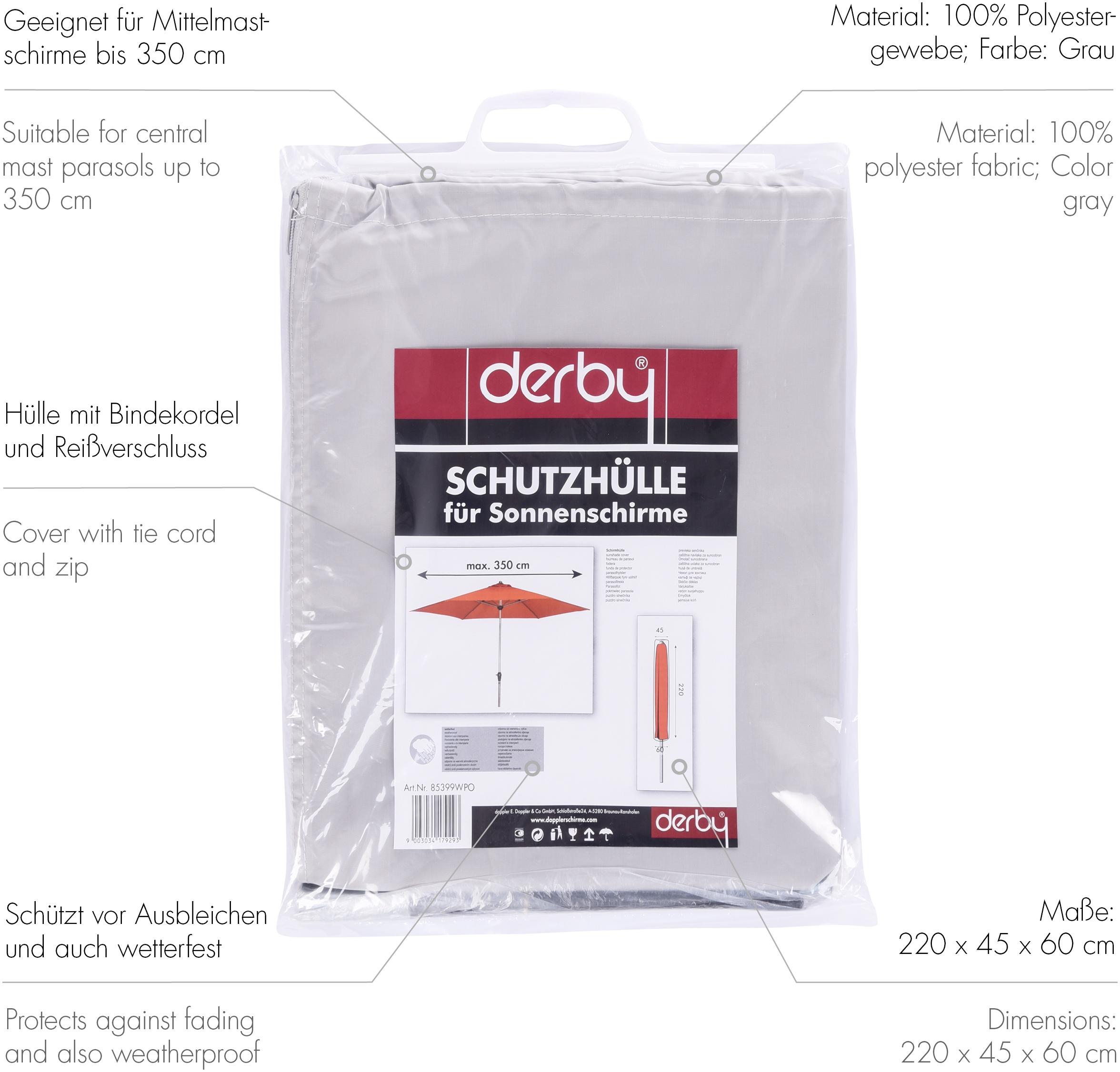 Die Doppler Schirmhülle für Sonnenschirme bietet optimalen Schutz für Mittelmastschirme bis zu einem Durchmesser von 350 cm. Hergestellt aus robustem, wetterfestem 100% Polyestergewebe, schützt sie zuverlässig vor Witterungseinflüssen wie Regen, Schnee und UV-Strahlen. Ein integrierter Reißverschluss mit Stab ermöglicht ein einfaches Öffnen und Schließen. Die Hülle ist ideal für die sichere Aufbewahrung Ihres Sonnenschirms, damit dieser stets einsatzbereit bleibt. **Highlights** - Passend für Sonnenschirme bis Ø 350 cm - Robustes und wetterfestes 100% Polyestergewebe - UV-beständig und wasserabweisend - Einfache Handhabung durch Reißverschluss mit Stab - Sicherer Halt durch praktischen Verschluss oder Kordelzug **Produkteigenschaften** - Farbe: hellgrau - Maße: passend für Sonnenschirme bis 350 cm - Material: 100% Polyestergewebe - Schützt vor Witterungseinflüssen und UV-Strahlen **Lieferumfang** - Doppler Gartenschirmhülle Basic für Sonnenschirme bis 350 cm – hellgrau