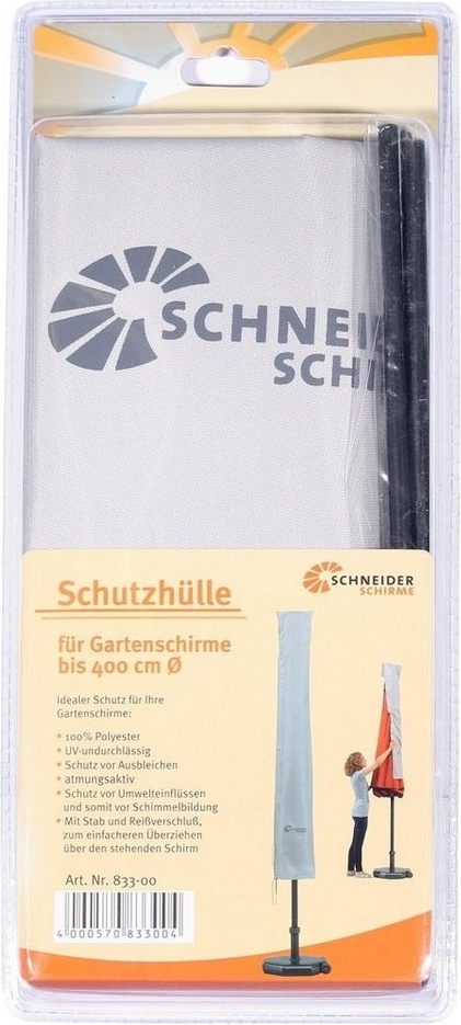 Schutzhülle für Sonnenschirme bis Ø 400 cm von Schneider Schirme. Diese hochwertige Hülle bietet optimalen Schutz vor UV-Strahlung und Ausbleichen. Sie ist lichtundurchlässig, wasserabstoßend beschichtet und atmungsaktiv. Mit einem praktischen Reißverschluss und einem Stab ausgestattet, ermöglicht sie eine einfache Handhabung. Die Abmessungen betragen 250x27/44 cm und das Material besteht zu 100 % aus Polyester. **Highlights** - Optimaler Schutz vor UV-Strahlung - Wasserabstoßend beschichtet - Lichtundurchlässig - Mit Reißverschluss und Stab - Atmungsaktiv **Produkteigenschaften** - Maße (B/T): 250x27/44 cm - Material: 100 % Polyester - Farbe: silbergrau - Für Sonnenschirme bis Ø 400 cm (nicht für Ampelschirme geeignet) - Nur für den privaten Gebrauch im Außenbereich