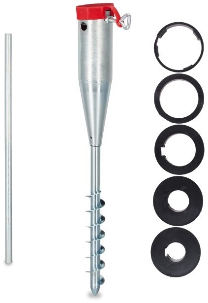 Die Bodenhülse für Sonnenschirme bietet eine stabile Lösung zur sicheren Verankerung Ihres Sonnenschirms im Boden. Sie eignet sich auch für Wäschespinnen und Fahnenmasten. Mit der praktischen Drehstange lässt sich die Hülse mühelos im Boden verankern. Fünf Adapter ermöglichen die Nutzung für unterschiedliche Stangendurchmesser. **Highlights** - Stabile Bodenhülse aus verzinktem Stahl für sicheren Halt - Drehstange ermöglicht einfaches Eindrehen in den Boden - Fünf Adapter für verschiedene Stangendurchmesser (25, 28, 42, 50, 55 mm) - Platzsparende Aufbewahrung von Zubehör im Inneren der Hülse - Ideal für Garten, Campingplatz oder Strand **Produkteigenschaften** - Maße gesamt H x B x T: ca. 56,5 x 7 x 7 cm - Maße Drehstange H x D: ca. 45 x 1,5 cm - Material: verzinkter Stahl, Kunststoff, Gummi - Gewicht insgesamt: ca. 1,4 kg **Lieferumfang** - 1x Bodenhülse mit Kappen - 1x Drehstange - 1x Feststellschraube - 5x Adapter - Dekoartikel sind im Lieferumfang nicht enthalten