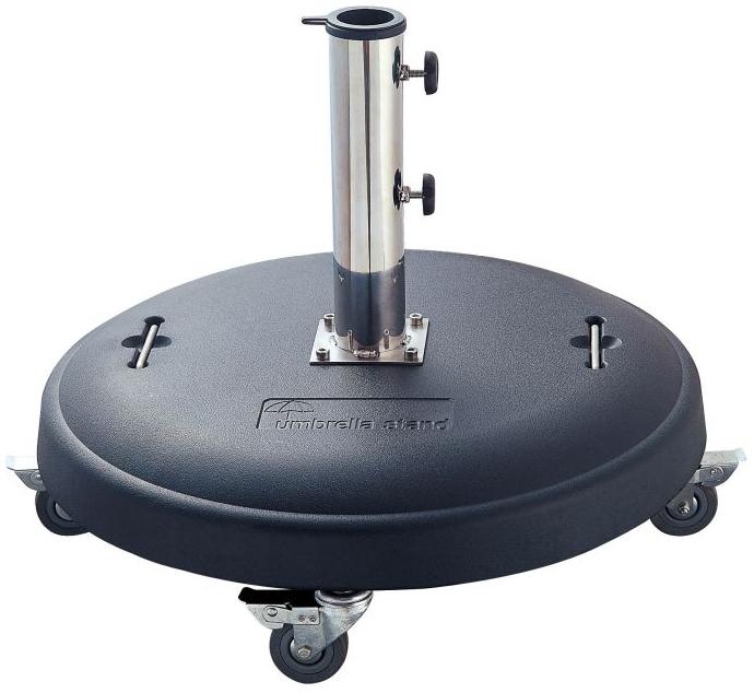 Universal-Schirmständer 50kg rund, mit Rollen, aus gegossenem Polymerbeton. Polymerbeton ist ein absolut witterungsbeständiges Acrylharz. Für Schirmstöcke bis 60mm Stärke. Reduzierstücke (57mm, 47mm, 37mm) im Lieferumfang enthalten. Durchmesser: 60cm Höhe Stein: 9,5cm Höhe incl. Rollen + Edelstahlrohr: 48,5cm