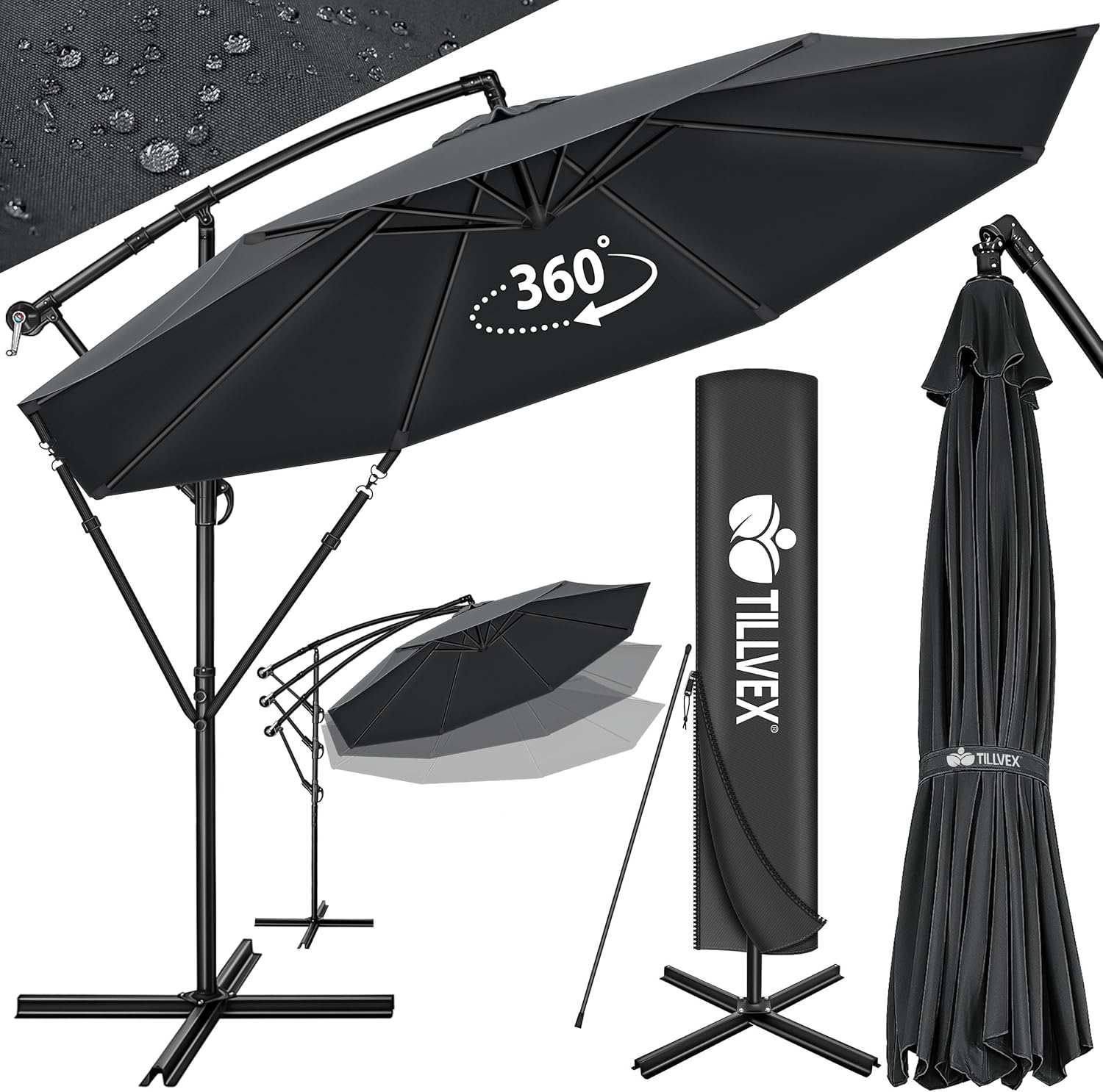 Der tillvex Sonnenschirm in Anthrazit mit einem Durchmesser von 3m ist der ideale Schattenspender für Terrasse oder Balkon. Der Ampelschirm aus Aluminium bietet mit UV-Schutz 50+ und wasserabweisendem Stoff optimalen Sonnenschutz. Dank Kurbel und Neigefunktion einfach zu bedienen und vielseitig einsetzbar. **Highlights** - UV-Schutz 50+: Schützt zuverlässig vor schädlicher UV-Strahlung - Neigung stufenlos verstellbar: Ermöglicht flexible Ausrichtung des Schirms - 360° drehbar: Bietet optimalen Schutz vor der Sonne - Wetterfest: Robust und langlebig für den Einsatz im Freien - Windfest: Stabiles Gestell für sicheren Halt auch bei windigem Wetter **Produkteigenschaften** - Material: Aluminiumgestell, 180 g/m² Polyesterschirm - Durchmesser: 3 m - Gesamthöhe: ca. 240 cm - Gewicht: 11 kg - 8 Schirmstreben, Ø Schirmstange: 42 mm - Ø Standrohr: 48 mm, Maße Standfuß: 100 × 100 cm - Benötigte Wegeplatten: 50x50 cm **Lieferumfang** - 1x Alu-Sonnenschirm - Montageanleitung