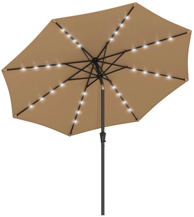 Der Schirm hat 32 LED-Lämpchen, die tagsüber durch das Solarpanel mit Strom versorgt werden und nachts eine romantische Atmosphäre im Freien schaffen. Der Strandschirm aus 180 g/m² Polyester bietet einen ausgezeichneten Sonnenschutz von UPF 50+ und hält mehr als 98% der UV-Strahlen problemlos ab. Drücken Sie einfach auf den Knopf am Gelenk, um den Sonnenschirm zu kippen. Die Verbindung aus einer Zinklegierung ist stark und sicher. Drehen Sie einfach an der Kurbel, um den 300 cm Terrassenschirm zu öffnen und zu schließen. Einfach und schnell! Die Konstruktion des Gartenschirms besteht aus hochwertigem, pulverbeschichtetem Metall, ist robust, stabil, rostbeständig und gewährleistet eine lange Gebrauchsdauer. **Die Highlights dieses Gartenschirms im Überblick:** - Mit LED-Beleuchtung: In der Nacht schaffen die 32 LED-Lämpchen eine romantische Atmosphäre im Freien. - Nach links/rechts um 30° neigbar: Drücken Sie auf den Knopf am Gelenk, um den Schirm zu kippen. - Ausgezeichneter Sonnenschutz: Der Sonnenschirm bietet einen hervorragenden UV-Schutz (UPF 50+) und hält mehr als 98% der UV-Strahlen ab. - Resistent gegen Nieselregen: Das Schirmtuch aus 180 g/m² Polyester ist wasserabweisend. - Leicht zu öffnen und zu schließen: Drehen Sie einfach an der Kurbel, um den Terrassenschirm zu öffnen und zu schließen. **Produktdetails:** - Farbe: Taupe - Material: Rahmen aus Stahl, 180 g/m² Polyestergewebe - Wölbung des Schirmtuchs: 300 cm - Horizontal-Durchmesser des Schirmtuchs: 290 cm - Höhe: 253,5 cm - Ø Schirmmast: 38 mm - Gewicht: 7,2 kg **Lieferumfang:** - 1 x Sonnenschirm - 1 x Anleitung **SONGMICS Hinweise:** - Ein Schirmständer wird nicht mitgeliefert. - Schließen Sie den Sonnenschirm nachts, bei starkem Wind oder bei regnerischem Wetter, um Beschädigungen zu vermeiden. - Öffnen Sie den Gartenschirm bitte nicht mit Gewalt, sondern sanft und langsam.