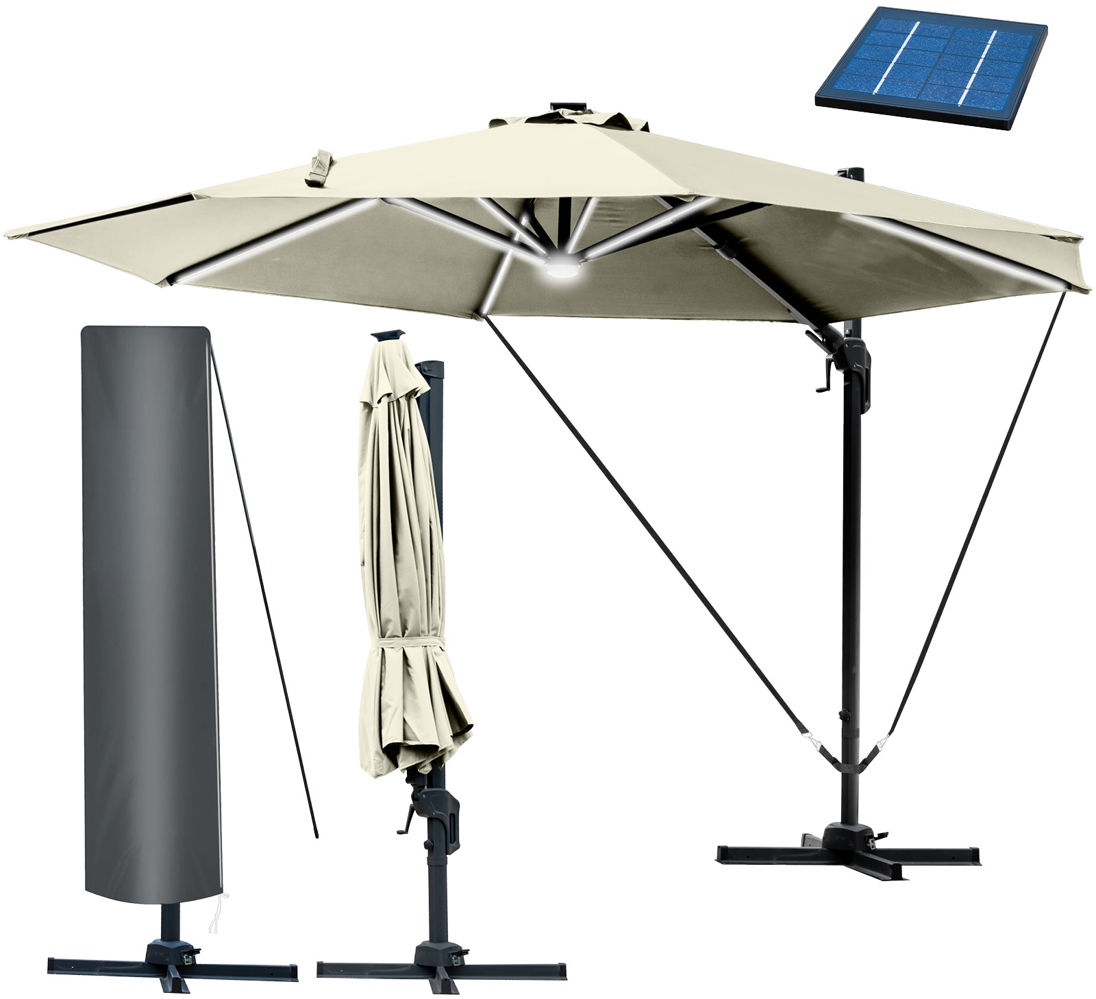 | Lieferumfang | 1x Ampelschirm, 1x Windsicherungssystem, 1x Wetterschutz-Abdeckhaube |
