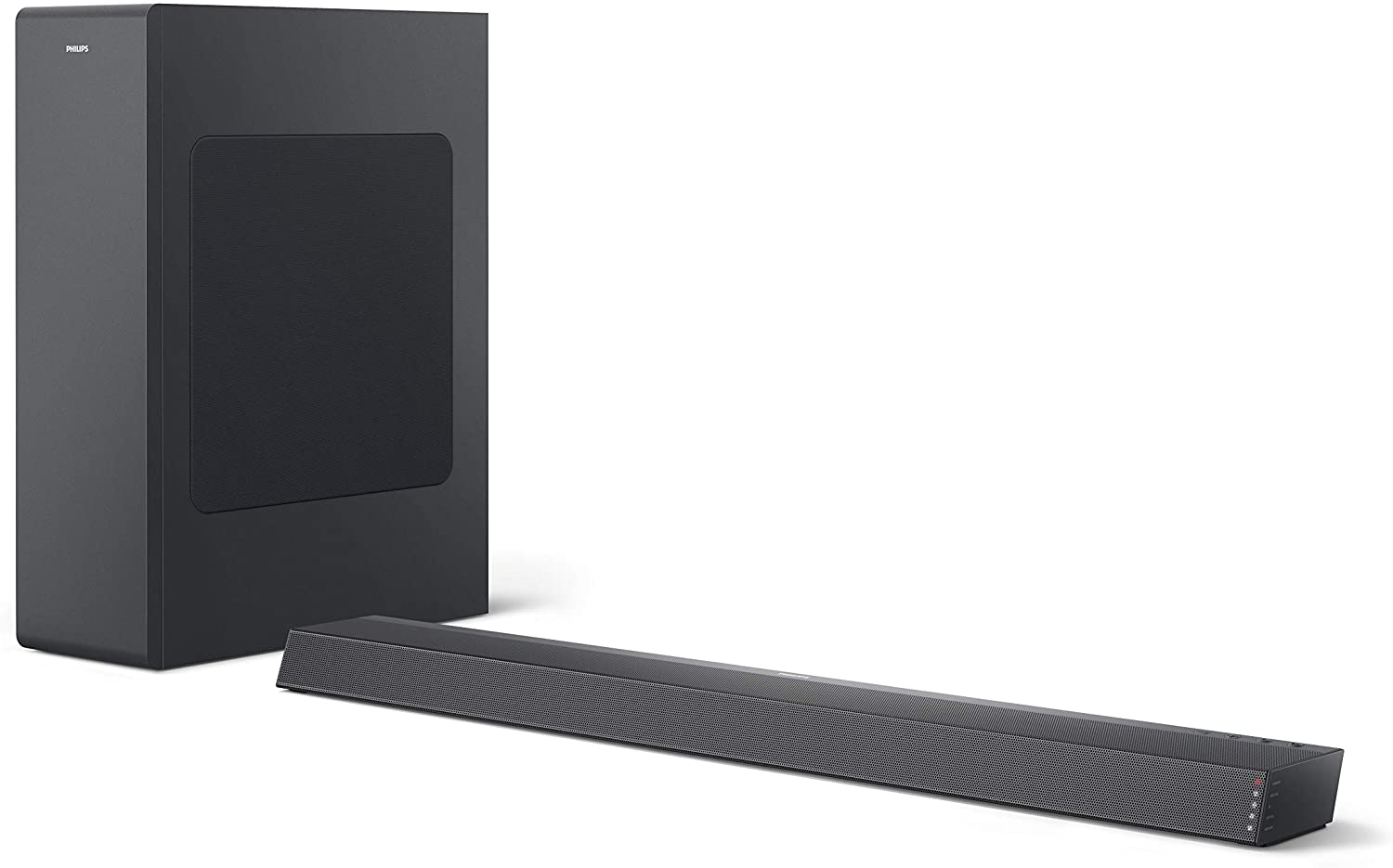 Wer sich für diese Soundbar von Philips entscheidet, bekommt vor allem ein Modell mit einem sehr guten Preis-Leistungs-Verhältnis. Für unter 150 Euro liegt dieses Modell zwar am unteren Ende der Preisliste für Soundbars, dies lässt sich jedoch nicht auf den Klang übertragen. Laut den von uns aggregierten Kundenbewertungen kann sich der Sound durchaus sehen lassen und mit der Mittelklasse mithalten. Neben dem soliden Klang ist vor allem erwähnenswert, dass der wuchtige Subwoofer kabellos funktioniert. Nutzerinnen und Nutzer müssen also keine Angst vor Kabelsalat haben.