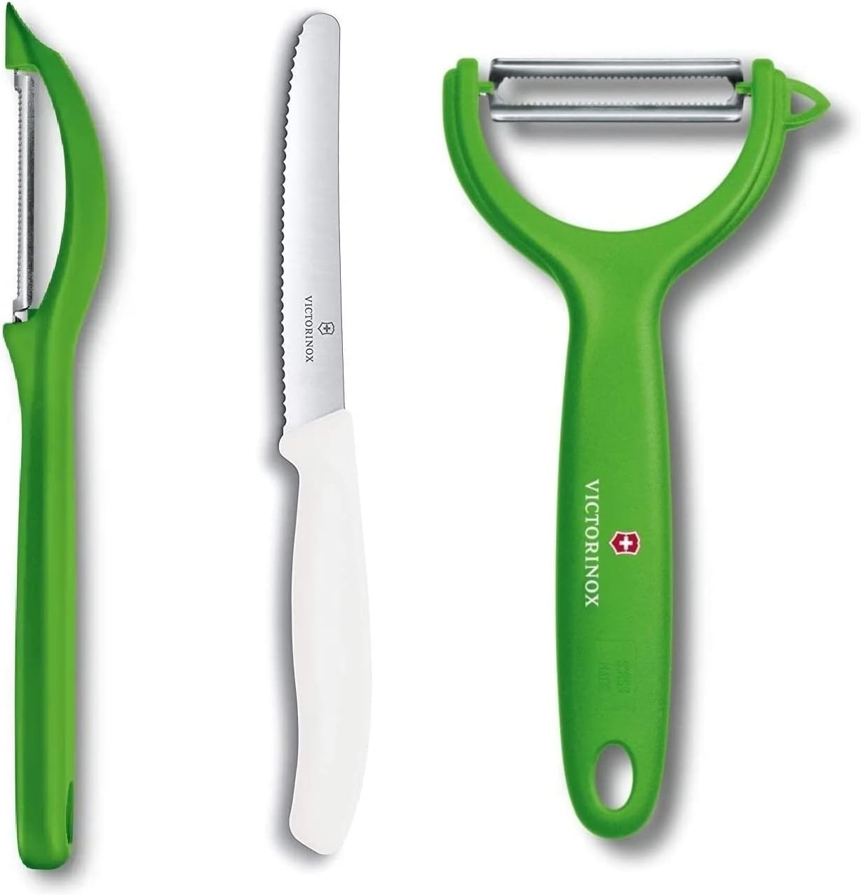 | Name | Victorinox 3-TLG. Universalschäler Set für Obst Gemüse, Extra scharf, Zackenschliff, Zweischneidig, Ergonomischer Griff (Grün / Weiß) |