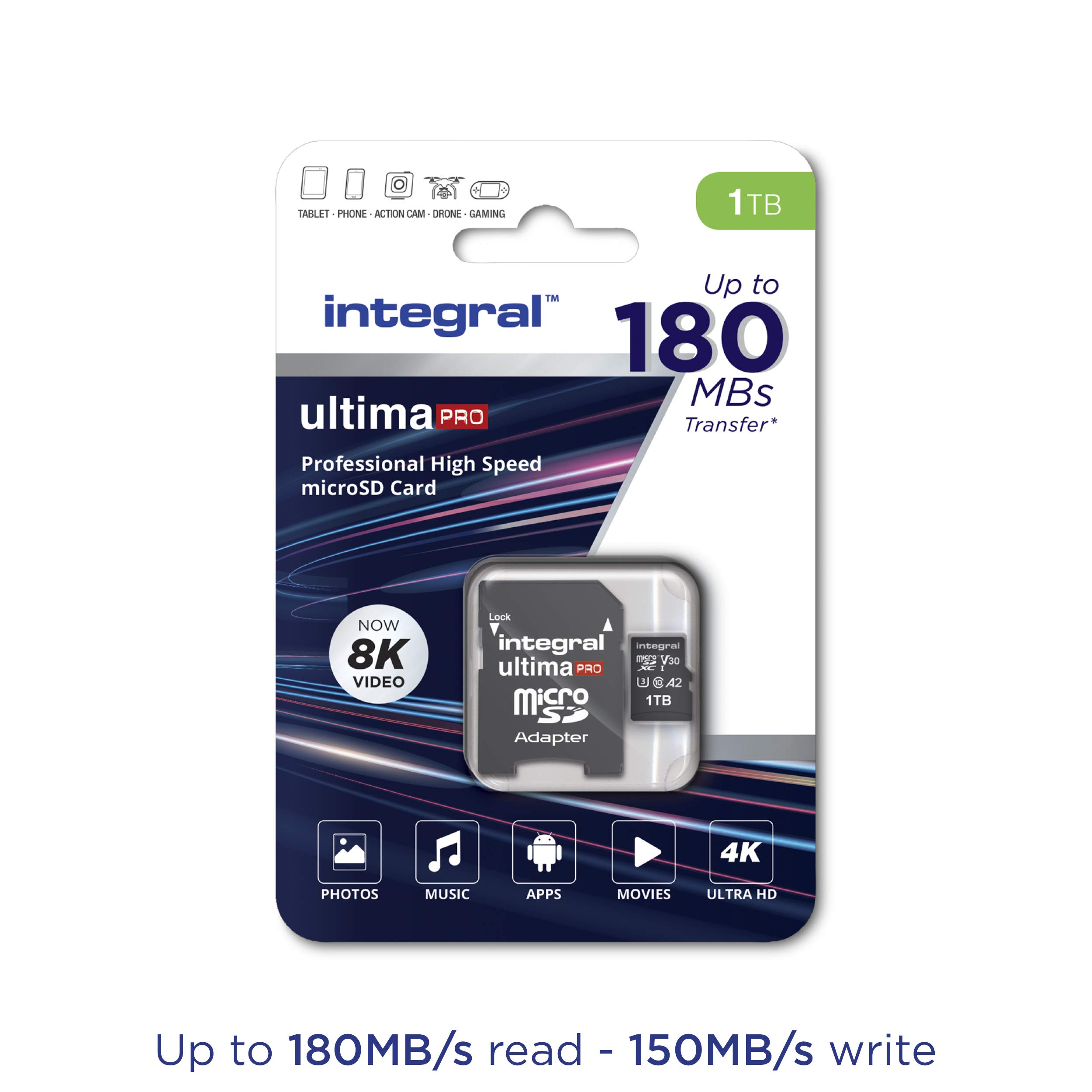 Die Integral Micro-SD Karte mit einer Speicherkapazität von 1TB eignet sich ideal für alle, die viel Wert auf eine schnelle und zuverlässige Speicherlösung legen. Dank der hohen Lesegeschwindigkeit von bis zu 180 MB/s können Sie problemlos Ihre hochauflösenden Videos in 8K oder 4K genießen. Auch das Schreiben geht dank einer Geschwindigkeit von bis zu 150 MB/s schnell und einfach.