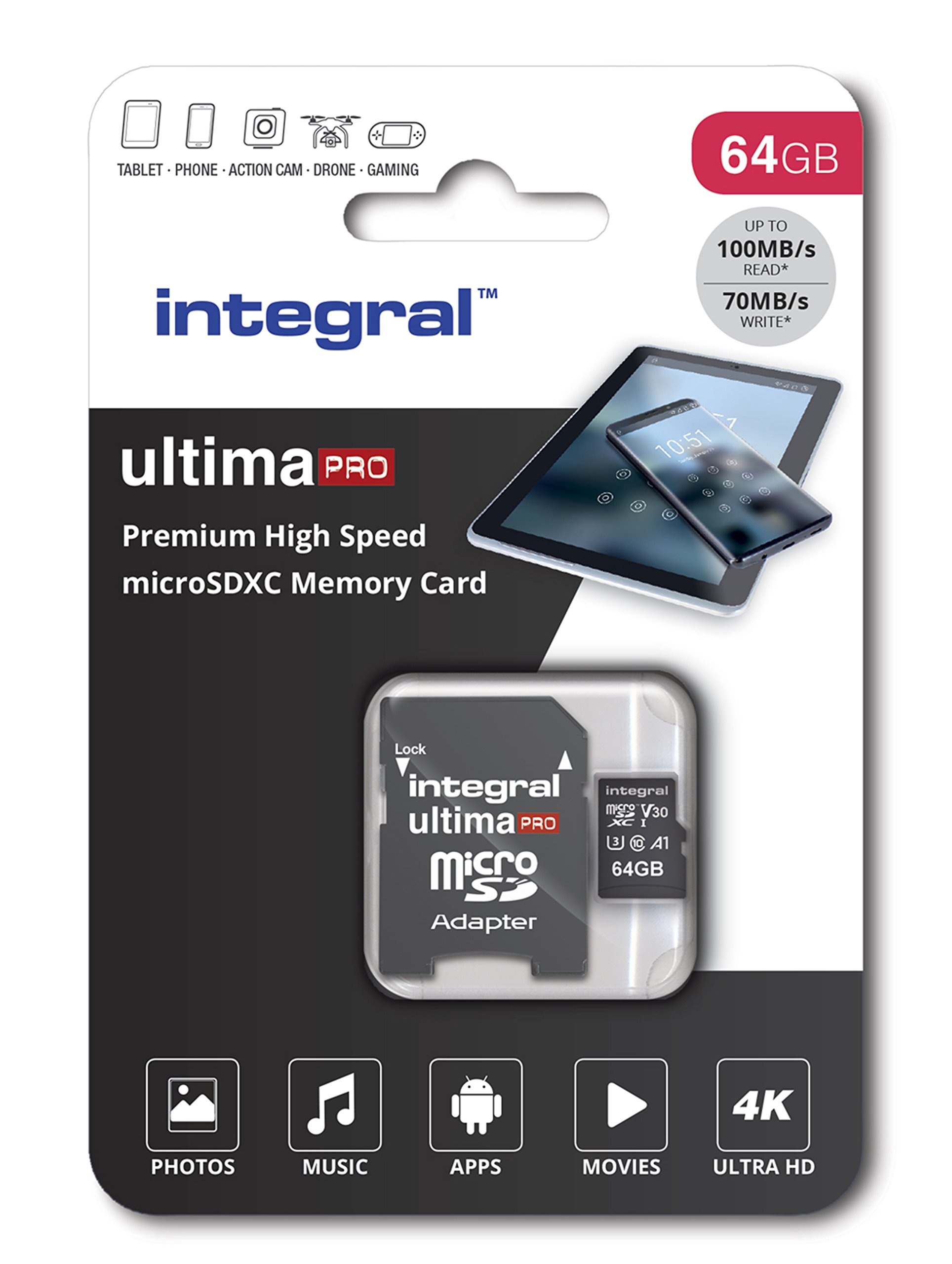 Die Integral Ultimapro - Memory Card 64 GB microSDHC-100 MB-s-Class 10 UHS-I U3- V30 + Adapter ist eine leistungsstarke Speicherkarte, die eine schnelle Übertragungsgeschwindigkeit bietet. Diese Karte eignet sich besonders für Dash Cams und Sicherheitskameras. Mit einem guten Preis-Leistungs-Verhältnis ist diese Speicherkarte in der Lage, große Datenmengen aufzunehmen und zu speichern.