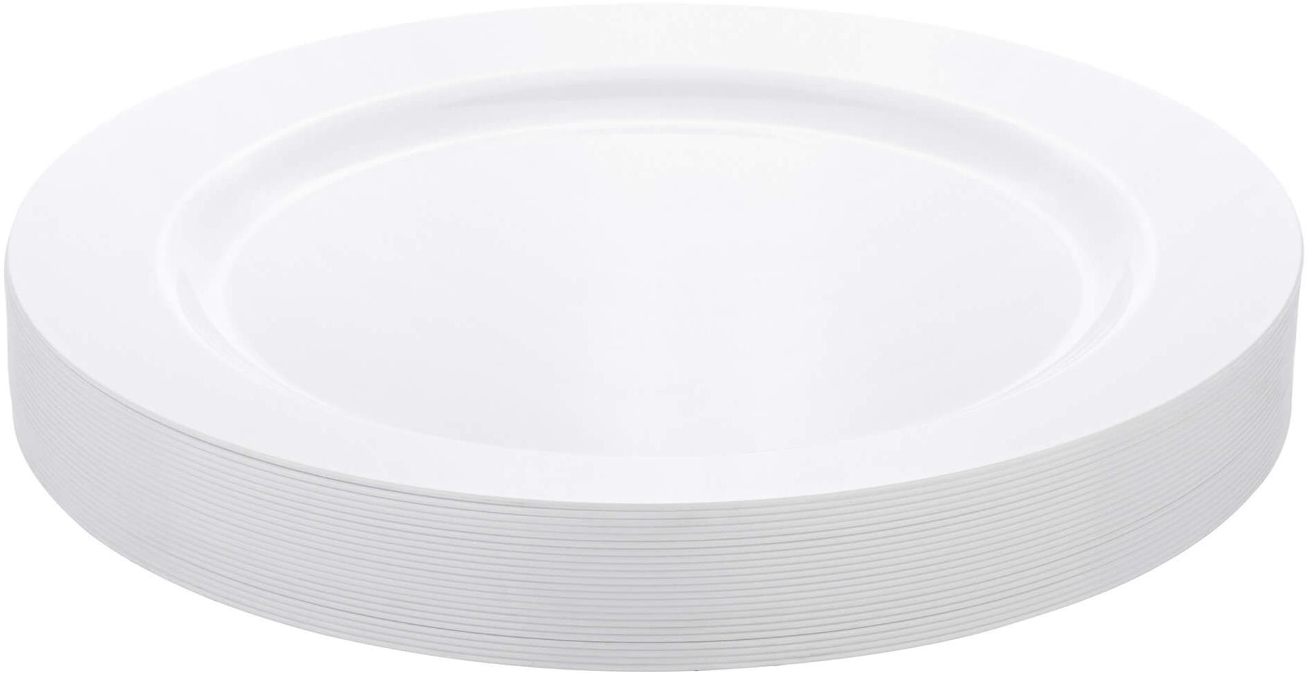 Mehrwegteller, Essteller Ø 26 cm, 25 Stück, aus robustem Polystyrol. Ideal für private Feiern, Camping und Gastronomie. Silberner Tellerrand für edlen Look. Merkmale: 25 stabile Mehrwegteller, lebensmittelecht, Ø 26 cm. Auch als Kuchenteller (Ø 18,5 cm) erhältlich. **Highlights** - Robuste Mehrwegteller aus lebensmittelechtem Polystyrol - Stabiler als herkömmliche Plastik- oder Pappteller - Ideal für private Feiern, Camping und Gastronomie - Silberner Tellerrand für edlen Look - Auch als Kuchenteller (Ø 18,5 cm) erhältlich **Produkteigenschaften** - Material: Polystyrol (PS) - Deutlich stabiler als dünne Plastik oder Pappteller - Speisetellergröße Ø 26 cm **Lieferumfang** - 25 Speiseteller aus Kunststoff, Gesamtdurchmesser ca. 26 cm, Einzelgewicht ca. 47 g