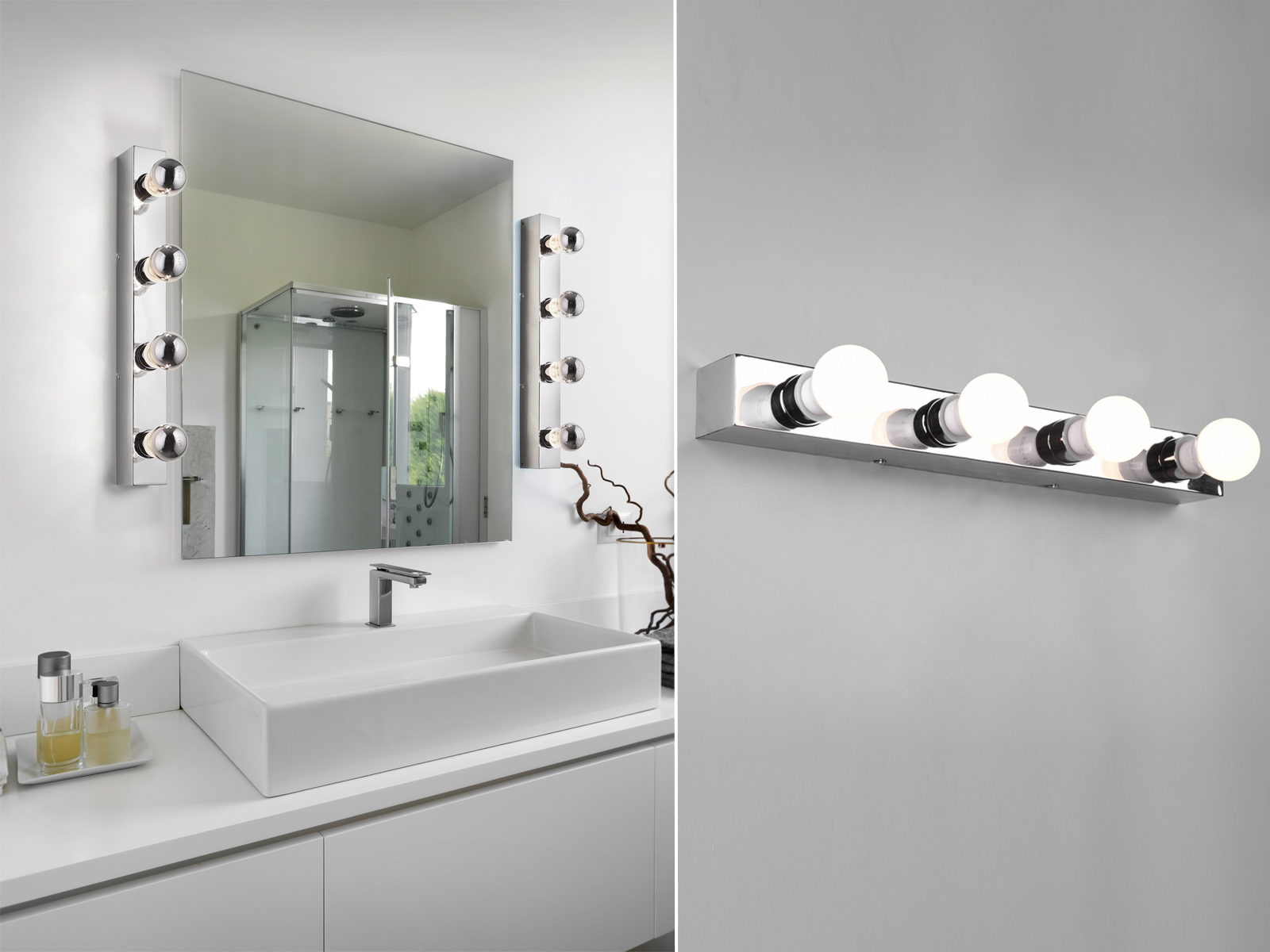 Verwandeln Sie Ihr Bad in eine Wohlfühloase! Mit passenden Badleuchten und Badlampen können Sie alle Bäder und Waschräume gekonnt in Szene setzen. Auf der Suche nach einer geeigneten Badezimmerbeleuchtung kommt man auch an dieser ausgefallenen Bad Wandleuchte aus dem Hause Trio Leuchten nicht vorbei. Die Retro Wandleuchte THEATRO erzeugt durch ihr Vintage Design eine ganz besondere Atmosphäre und lässt Sie in die Welt von Hollywood abtauchen. Fühlen auch Sie sich wie ein Star, indem Sie die Leuchten zur Spiegelbeleuchtung verwenden und sie an der Wand seitlich neben dem Badspiegel oder darüber anbringen. Der Silber Chrom Korpus verleiht der Badezimmer Lampe eine exklusive Optik. Mit einer Breite von 55 cm und einer Ausladung von 8,5 cm ist sie auch für kleine Bäder gut geeignet. Mit einer Schutzart von IP44 können die Badlampen dabei gemäß den vorgegebenen Schutzbereichen überall im Badezimmer angebracht werden. Doch nicht nur im Bad machen diese Wandleuchten eine gute Figur, sie eignen sich ebenfalls hervorragend als moderne Beleuchtung im Treppenhaus oder in Flur und Diele. Die Wandlampe ist mit vier E27 Fassungen ausgestattet und für Leuchtmittel mit einer Leistung von max. 10 Watt geeignet. Diese sind nicht im Lieferumfang enthalten.