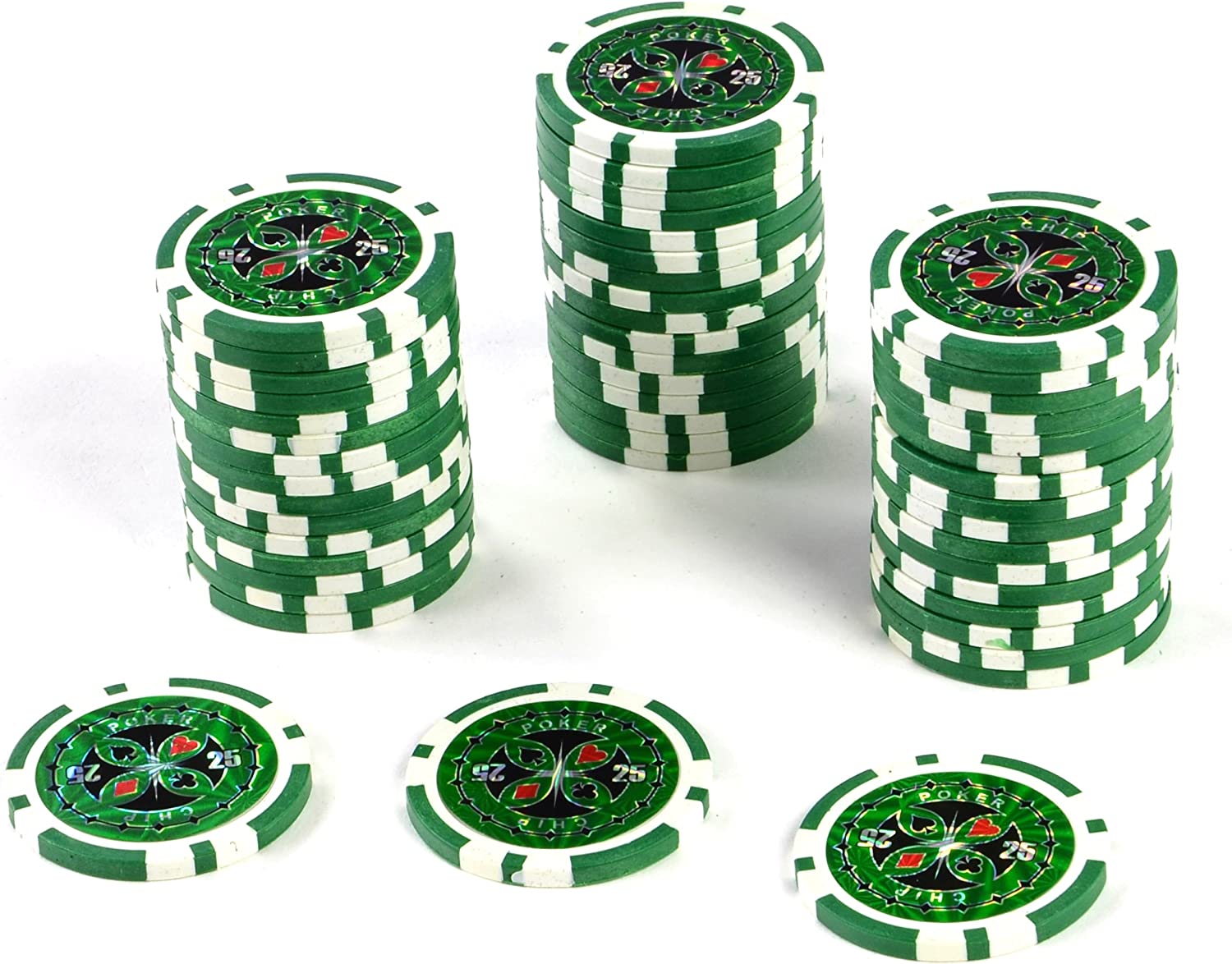 | Beschreibung | 1 Rolle Pokerchips mit 50 Einzel-Jetons mit eingegossenen Metallkern. Ideal für Turniere aller Poker-Varianten und Black-Jack, zum Stapeln, Shuffeln und für Tricks wie z. B. Finger Flips usw. Diese qualitativ hochwertigen Laser-Chips mit dem Wertaufdruck „25“ in der Farbe Grün, sind stark reflektierend. Das Gewicht von ca. 12 Gramm entspricht den gängigen Casino-Jetons. Durchmesser ca. 4 cm / Stärke ca. 4 mm und passen so in jeden gängigen Chiphalter/ Chiptray Die Werte unserer professionellen Casino Jetons sind durch unterschiedliche Farben gut erkennbar. Bei uns erhältlich: Farbe (Wert); Grau (1) ; Rot (5); Blau (10); Hellblau (50); Schwarz (100); Lila (500); Gelb (1000); Pink (5000); Braun (10000), Hersteller: Nipach Gmb H |