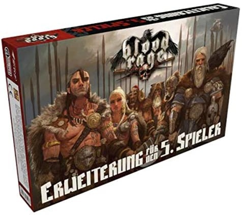 Die Blood Rage: Erweiterung für den 5. Spieler führt den mächtigen Ram Clan in Blood Rage ein! Dieser Clan wird komplett mit 8 Kriegerfiguren (in zwei verschiedenen Formen), 1 Anführerfigur, 1 Schiffsfigur, 1 Clanbogen, 1 Plastik-Ruhmesmarker, 4 Clanplättchen aus Pappe, 11 kleinen farbigen Bases und 2 großen farbigen Bases geliefert. Mit dieser Erweiterung wird die Möglichkeit eingeführt, Blood Rage mit 5 Spielern zu spielen. Der Spielplan unterstützt dies, indem einfach keine Provinz vor Spielbeginn durch Ragnarök zerstört wird. Mehr Spieler brauchen jedoch mehr Karten, deshalb enthält diese Erweiterungsbox 24 "Göttergaben"-Karten (8 für jedes Zeitalter-Deck). Auf allen diesen Karten ist die Voraussetzung "5+" Spieler angegeben. Die meisten dieser Karten sind zusätzliche Kopien von Karten aus dem Grundspiel, aber es gibt auch ein paar neue, wie die "Widespread!" Quest, bei der du 2 beliebige Provinzen beherrschen musst.
