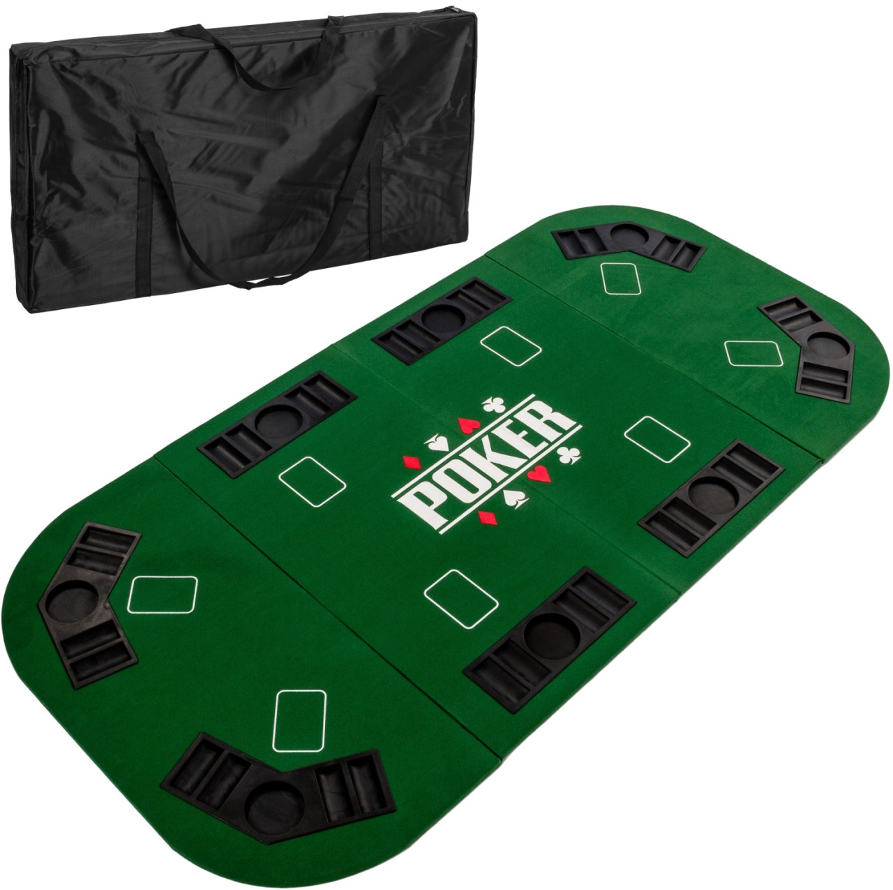 GAMES PLANET® XXL Pokertischauflage in Farbe grün mit den Maßen 160x80cm für bis zu 8 Pokerspieler Die Poker-Tischauflage ist schnell & platzsparend zusammenklappbar (2-fach klappbar auf nur 80x40cm) Der Bezug aus Premium Filz und der stilechte Poker Aufdruck geben der Pokertisch Auflage ein edles Erscheinungsbild In den praktischen Chiptrays und Getränke Einlegern haben die Pokerchips und Getränke jedes Spielers Platz Ob Draw Poker, Stud, oder das beliebte Texas Hold´em, an dieser Auflage macht Pokern einfach Spaß. Die Auflage besteht aus einer 11 mm starken Faserplatte. Das strapazierfähige Filztuch ist erhältlich in den Farben Grün, Blau und Rot. Damit auch der längste Pokerabend zum Erlebnis wird, verfügt die Auflage neben den 8 Chiptrays noch zusätzlich über 8 Getränkehalter. Die Pokerauflage ist bereits komplett vormontiert, so dass Sie diese nur noch aufklappen müssen. Das perfekte Casino-Erlebnis kann so in wenigen Minuten beginnen! Mit der mitgelieferten Tragetasche haben Sie die Möglichkeit die Auflage gut zu verstauen bzw. einfach überall mit hin zu nehmen. Die Lieferung erfolgt ohne Pokerchips und -karten. Diese können Sie bei uns separat z.Bsp. unter den Artikelnummern 20030017 oder 20030019 erwerben. Lieferumfang: 1x Pokerauflage, 4-fach zusammenklappbar 1x Tragetasche mit Henkel