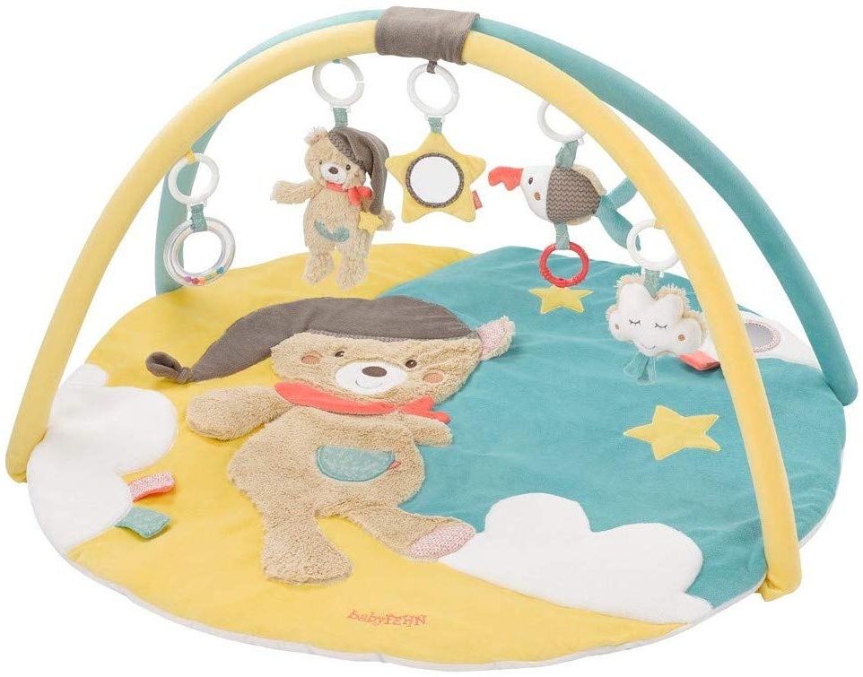 Ein echtes Kuschelspielparadies. Willkommen in der niedlichen Bruno-Welt von Fehn. Diese süße 3-D Spiellandschaft bereitet Ihrem Baby ganz viel Freude. Gehen Sie mit Ihrem Liebling auf Entdeckungsreise. Die Activity-Decke mit abnehmbaren Spielbogen ist der erste Spielplatz für Ihr Baby. Verschiedene Materialien, Farben und Muster, viele verborgene Spielfunktionen und liebenswerte Rasselfiguren regen Ihr Baby zum Greifen, Tasten, Fühlen, Hören und Entdecken an und fördern so spielend seine Entwicklung. Eine komfortable Polsterung und die superweichen, hautsympathischen Stoffe machen die Decke zu einer bequemen Liegefläche. Der hochwertige Velours ist ideal zum Greifen, Schmusen und Nuckeln. Ein toller Spiel- und Kuschelspaß. - fünf abnehmbare Spielzeuge - Spiegel, Dingdong, Rassel, Quietsche, Raschelpapier, Materialmix - Größe ca. Ø 85 cm - waschbar bei 30°C - von Geburt an 0+