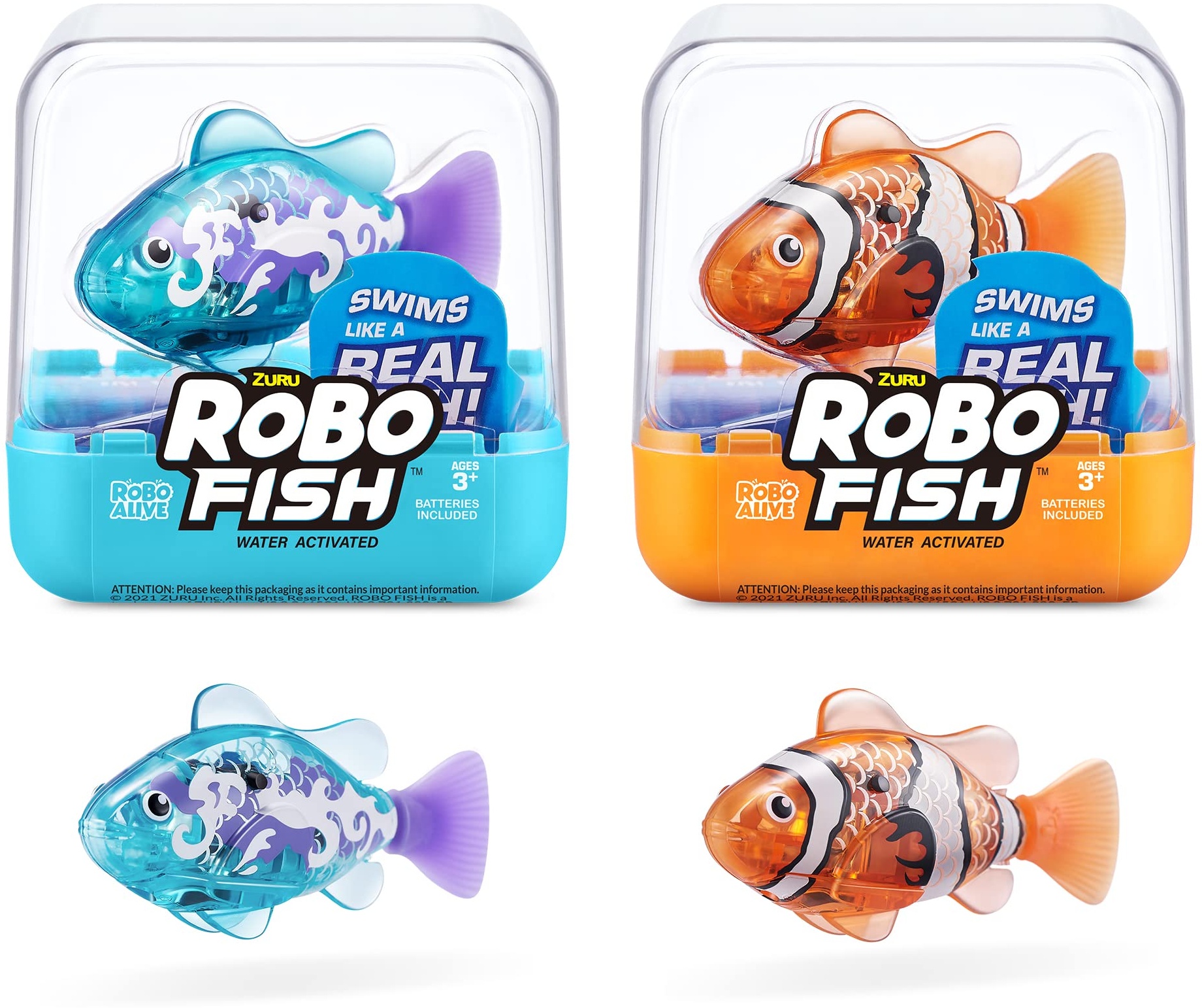 | Name | ROBO ALIVE Robo Fish Serie 3 Roboter-Fisch, 2er-Pack, orange und blaugrün, schwimmt in mehrere Richtungen, batteriebetrieben, Spielzeugfisch, Poolspielzeug (2er-Pack, orange und blaugrün) |