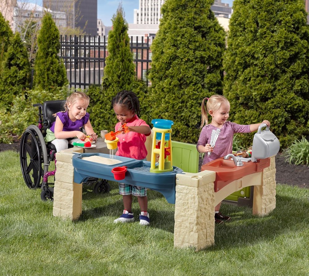 Bietet eine Vielzahl an Spielbereichen, darunter eine Küche und einen Sandkasten, für vielseitigen Spielspaß.