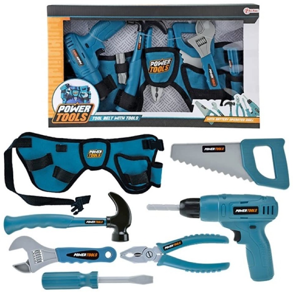 KINDERWERKZEUG: Mit diesem Werkzeugset inklusive Werkzeug-Gürtel kann die Werkzeugkiste des Kindes optimal ausgestattet werden. Der Fantasie sind keine Grenzen gesetzt. GÜRTEL: Der Werkzeuggürtel wirkt dank der echten Schnallen sehr realistisch und sitzt bequem. Die perfekte Aufbewahrung für Werkzeug unterwegs. REALISTISCH: Auf Knopfdruck dreht sich der Bohrer, wodurch das Spielzeug einen tollen Effekt bekommt. Mit der Schutzbrille wirkt das Spielzeug noch echter! (Batterien 2x AA nicht im Lieferumfang) SICHERHEIT: Das Spielzeug entspricht den europäischen Richtlinien und Sicherheitsanforderungen. Das Set enthält: Hammer, Säge, Schraubenzieher, Schraubenschlüssel, Zange und Bohrer. TOI-TOYS ist der führende Anbieter von attraktivem Spielzeug in mehr als 40 Ländern weltweit. Wir garantieren attraktives Spielzeug für einen guten Preis, ohne auf Sicherheit zu verzichten, Hersteller: POWER TOOLS