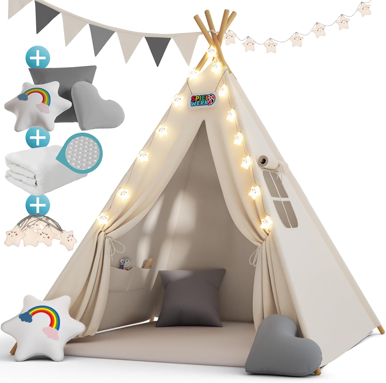 | Name | Spielwerk Kindertipi mit Lichterkette, Bodenmatte & Kissen, Baumwolle weiß, 120 x 120 x 160 cm |