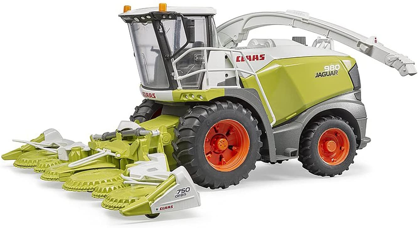 Der Jaguar 980 ist der größte Feldhäcksler im Sortiment des Erntemaschinen Spezialisten Claas. Mit der Beeindruckenden Leistung eines V12 Dieselmotors mit 884 PS sowie neu entwickelten Antriebs und Erntesystemen ist diese Maschine überall dort im Einsatz, wo große Feldflächen schnell und effizient abgeerntet werden sollen. Ein sehr detailtreues Modell im Maßstab 1:16 kommt neu in das landwirtschaftliche Sortiment von BRUDER. Das imposante Maisgebiss des Feldhäckslers ist ausgestattet mit 6 angetriebenen Einzugscheiben und der Auswurfkrümmer lässt sich spielerisch in jede gewünschte Richtung drehen. Türe und Motorhaube zum Öffnen geben Einblick auf die detaillierte Fahrerkabine und den imposanten Motor und unterstreichen einmal mehr das Credo von Bruder, „just like the real thing“. Ein weiteres Highlight sind die wechselbaren Räder, die den Spielwert noch einmal steigern. Erweitert werden kann dieses tolle Fahrzeug durch das Mechaniker Set (Art.-Nr. 62100). **Highlights** **Fahrerhaus** - Fahrerkabine aus transparentem und hochwertigem Kunststoff - Tür zum Öffnen **Fahrzeugaufbau** - aufklappen der Seitenabdeckung ermöglicht Sicht auf den Motor - klappbares Maisgebiss mit 6 angetriebenen Einzugsscheiben - einstellbarer Auswurfkrümmer - Maisgebiss ist pendelnd aufgehängt und abnehmbar **Fahrwerk** - Lenkbare Hinterachse - geländegängige Pendelachse - Abnehmbare Vorderräder **Allgemein** - Achtung! Nicht für Kinder unter 36 Monaten geeignet. Erstickungsgefahr wegen verschluckbarer Kleinteile. - Altersempfehlung: ab 4 Jahren zum Spielen für Innen und Außen geeignet - hergestellt aus hochwertigen Kunststoffen wie z.B. ABS - Kompatibel mit Figur - Maßstab 1:16
