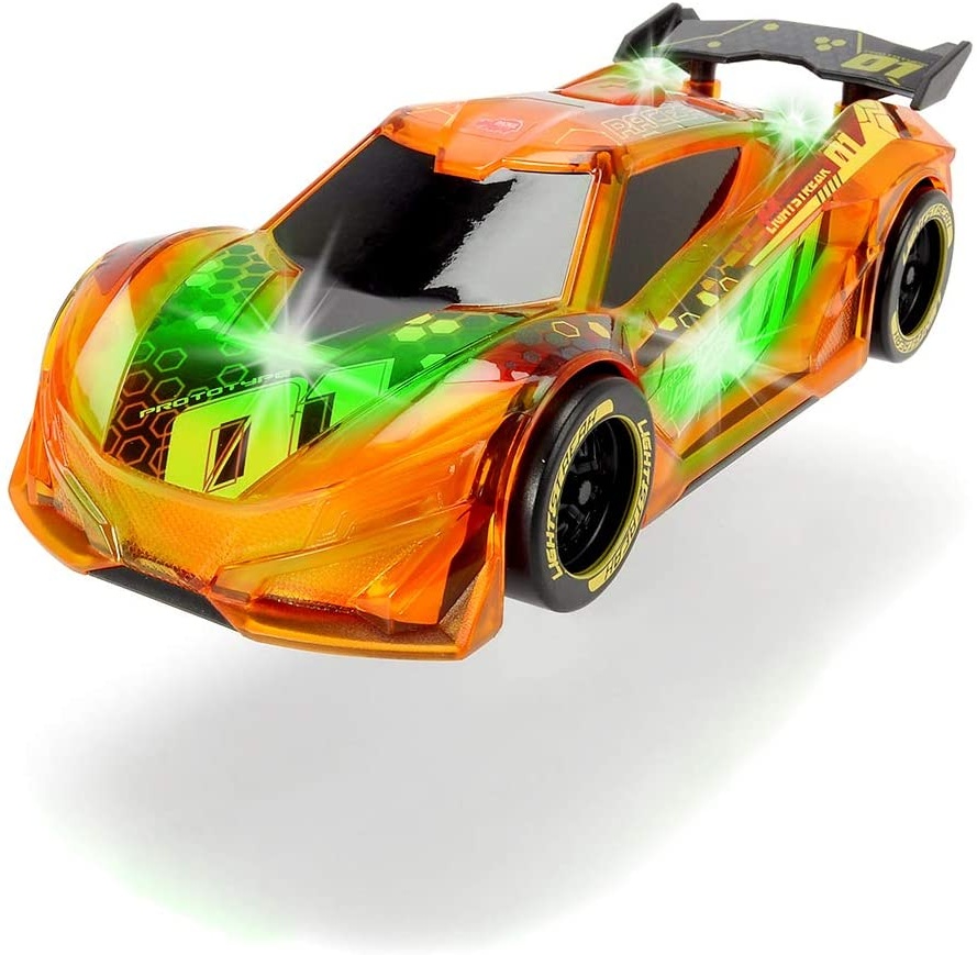 | Name | Dickie Toys Lightstreak Racer, leuchtendes Rennauto mit Friktionsantrieb, Licht & Soundwechsel, inkl. Batterien, 20 cm, orange |
