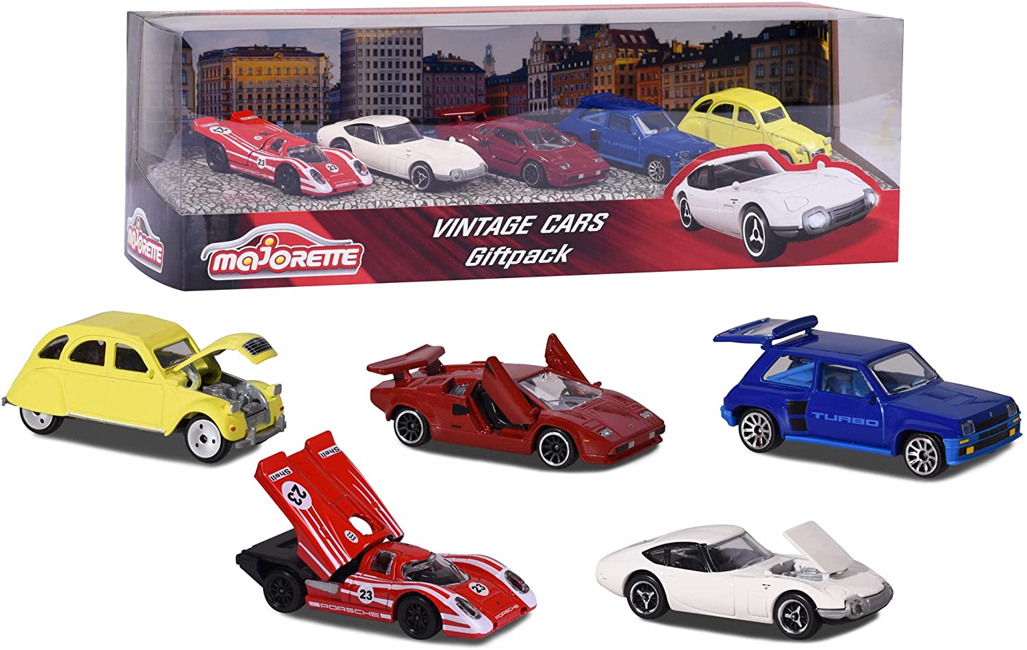 | Name | Majorette Vintage 5er-Geschenkset, Spielzeugautos mit Freilauf aus Metall, Vintage-Versionen von Ford, Porsche, Renault und VW, bewegliche Teile, 7,5 cm |