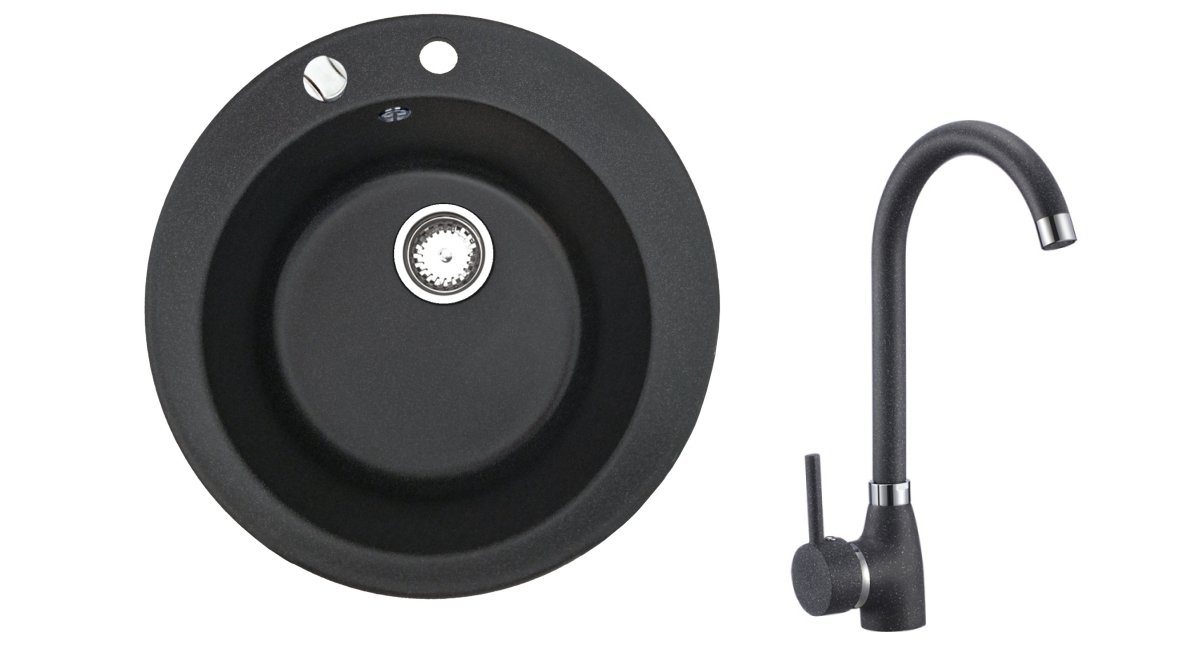 • eine runde Granitspüle ohne Abtropffläche und einer eleganten Schwarz Armatur