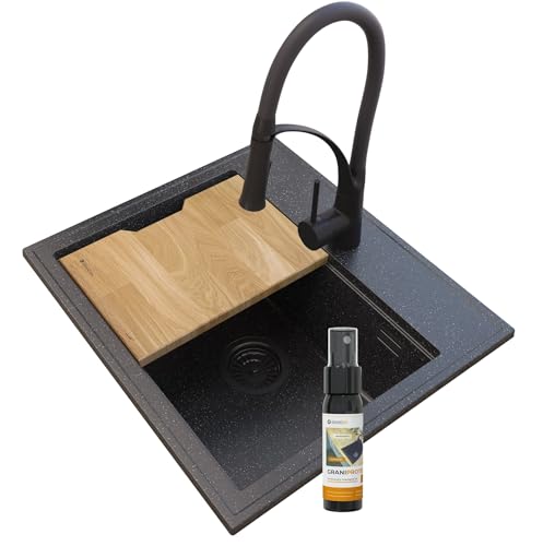 Granitan Schwarz Granit Einbauspüle FOXAL + NEXO Küchenarmatur herausziehbar - Komplettset mit manuellem Siphon & passgenauem Holzbrett