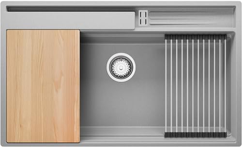 Primagran Spülbecken Oslo Pocket Grau 88x53cmGranitspüle 1 Becken + Ablauf-Set, Küchenzubehörset - XXL Becken, innovativer Organisator, Level-System