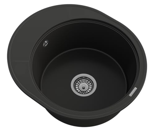 Granitan Rundes Einzelbecken Granitspüle mit Abtropffläche - Montage auf Arbeitsplatte - Chrom Siphon & Imprägnierung RAMIS Schwarz