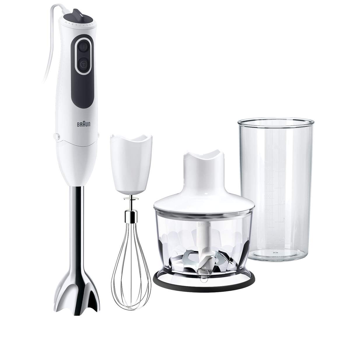 | Lieferumfang | Edelstahl-Schneebesen, Zerkleinerer, Mix- und Messbecher (600ml) | inkl. 4-teiligem Zubehör-Set | Mix- und Messbecher 600 ml, Schneebesen Edelstahl, Zerkleinerer 350 ml | Stabmixer, Pürierstab, XL Food Prozessor mit 3,2L Schüssel, Zekleinerer 0,5L, Gemüsestampfer, Mixbehälter 0,6L & Schneebesen | Zubehör: Multimesser, Bedienungsanleitung mit Rezepten | Handmixer, Stabmixer, Zerkleinerer, 700-ml-Zerkleinerungsaufsatz, Rezeptheft | MultiQuick 5 Pro Stabmixer, Mini-Küchenmaschinen Aufsatz, Schneid-/Zerkleinerungsscheibe, 500 ml Zerkleinerer, Größenverstellbarer Zerkleinerer, Hackmesser/Eiscrush-Messer, Schneebesen, Messbecher | Messbecher 700ml, Zerkleinerer-Aufsatz, Schneebesen, Kartoffelstampfer, mit Deckel | Edelstahl-Mixfuß, Spiralkabel, Zerkleinerer, Schneebesen, Mixbecher | - | Messbecher, Schneebesen, Zerkleinerer | Multimesser, Wandhalter, Bedienungsanleitung mit Rezepten | Abnehmbarer Mixstab, Edelstahlfuß, Edelstahlmesser, Hängeschlaufe | + Messbecher | - | 1 x Mix-/Messbecher, 1 x Mixstab Edelstahl, 1 x Schlagbesen, 1 x Universalzerkleinerer, 1 x Kunststoff-Teigwerkzeug, 1 x Würfelschneider, 1 x Schneideinsatz dünn, 1 x Schneideinsatz dick, 1 x Raspel-Einsatz medium, 1 x Food Prozessor-Einheit, 1 x Würfeleinsatz 9mm, 1 x Gitterreiniger-Werkzeug | Multimesser, Schlagscheibe, Quirlscheibe, Bedienungsanleitung mit Rezepten | Inkl. Edelstahl-Schneebesen, Inkl. 0,5 Liter Mixbecher aus Kunststoff mit Messskala und Ausgießer | 1 x Stabmixer, 1 x Schneebesenaufsatz, 1 x Zerkleinerer, 1 x Mixbehälter (1L) | Multimesser, Schlagscheibe, 600 ml Mixbecher, Wandhalter, Bedienungsanleitung mit Rezepten | - |