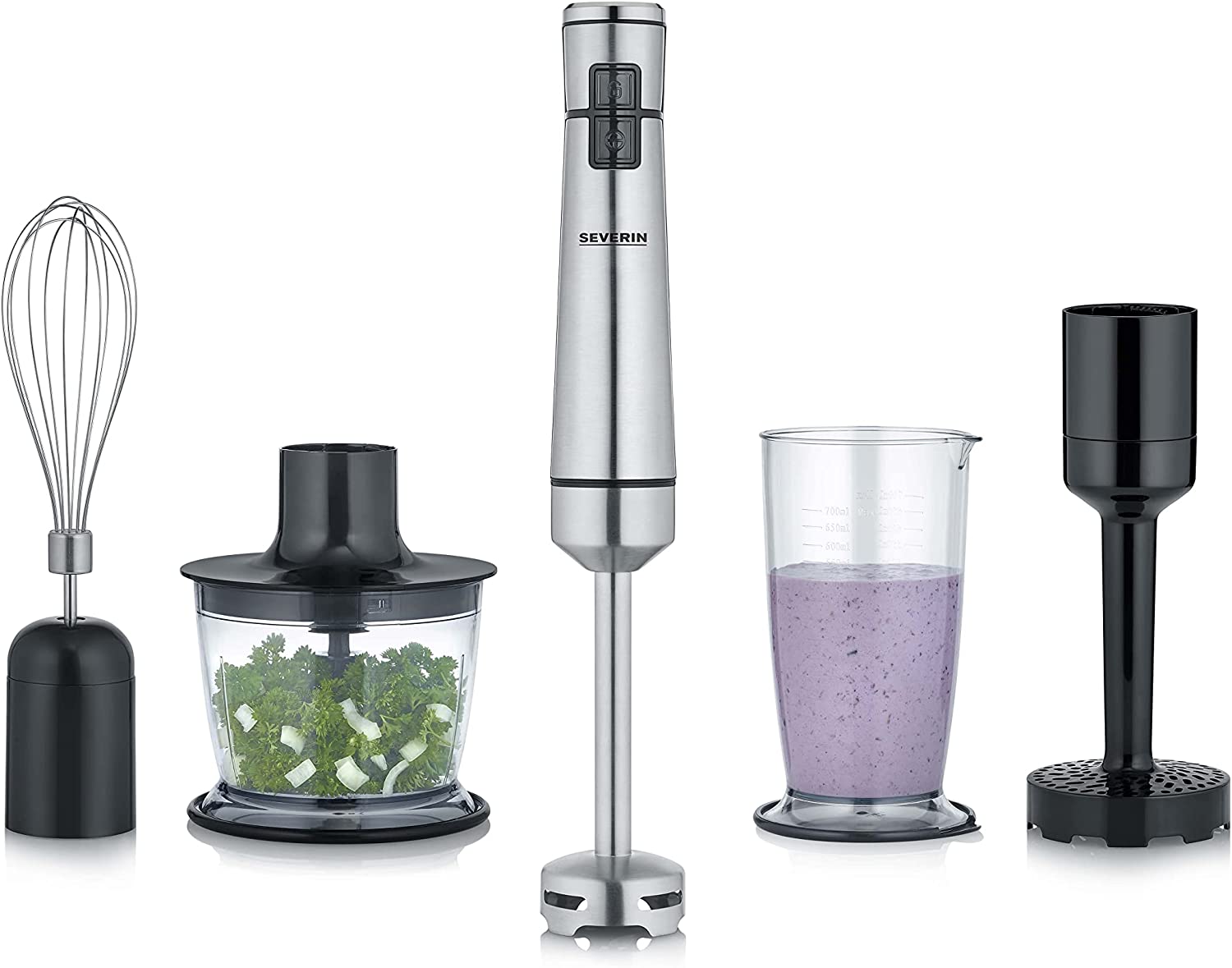 | Lieferumfang | inkl. Mixbehälter (0,7 Liter), Kartoffelstampfer, Zerkleinerer, Schneebesen |