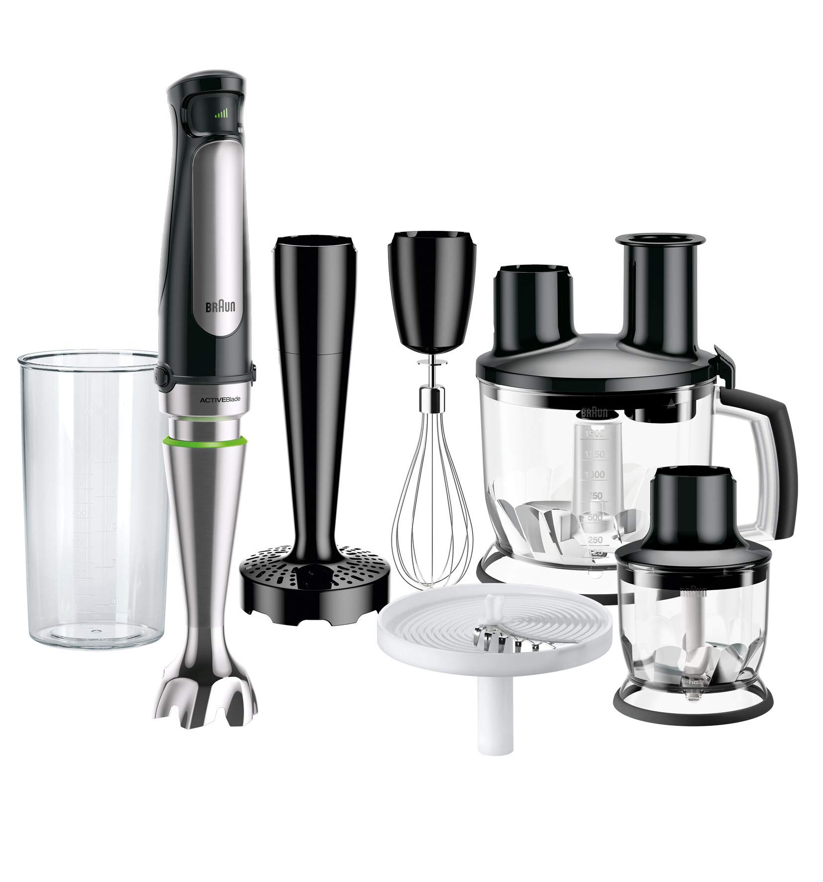 | Lieferumfang | inkl. 11-teiligem Zubehör-Set | inkl. 4-teiligem Zubehör-Set | Mix- und Messbecher 600 ml, Schneebesen Edelstahl, Zerkleinerer 350 ml | Handmixer, Stabmixer, Zerkleinerer, 700-ml-Zerkleinerungsaufsatz, Rezeptheft | Stabmixer, Pürierstab, XL Food Prozessor mit 3,2L Schüssel, Zekleinerer 0,5L, Gemüsestampfer, Mixbehälter 0,6L & Schneebesen | MultiQuick 5 Pro Stabmixer, Mini-Küchenmaschinen Aufsatz, Schneid-/Zerkleinerungsscheibe, 500 ml Zerkleinerer, Größenverstellbarer Zerkleinerer, Hackmesser/Eiscrush-Messer, Schneebesen, Messbecher | Zubehör: Multimesser, Bedienungsanleitung mit Rezepten | Messbecher 700ml, Zerkleinerer-Aufsatz, Schneebesen, Kartoffelstampfer, mit Deckel | Edelstahl-Mixfuß, Spiralkabel, Zerkleinerer, Schneebesen, Mixbecher | - | Messbecher, Schneebesen, Zerkleinerer | Multimesser, Wandhalter, Bedienungsanleitung mit Rezepten | Abnehmbarer Mixstab, Edelstahlfuß, Edelstahlmesser, Hängeschlaufe | + Messbecher | Multimesser, Schlagscheibe, Quirlscheibe, Bedienungsanleitung mit Rezepten | Inkl. Edelstahl-Schneebesen, Inkl. 0,5 Liter Mixbecher aus Kunststoff mit Messskala und Ausgießer | - | 1 x Mix-/Messbecher, 1 x Mixstab Edelstahl, 1 x Schlagbesen, 1 x Universalzerkleinerer, 1 x Kunststoff-Teigwerkzeug, 1 x Würfelschneider, 1 x Schneideinsatz dünn, 1 x Schneideinsatz dick, 1 x Raspel-Einsatz medium, 1 x Food Prozessor-Einheit, 1 x Würfeleinsatz 9mm, 1 x Gitterreiniger-Werkzeug | 1 x Stabmixer, 1 x Schneebesenaufsatz, 1 x Zerkleinerer, 1 x Mixbehälter (1L) | Multimesser, Schlagscheibe, 600 ml Mixbecher, Wandhalter, Bedienungsanleitung mit Rezepten | - |