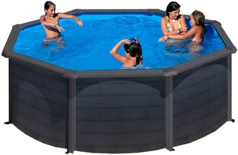 Kea Stahlwandpool Rund Ø 350x120 cm. Der elegante und witterungsbeständige Kea Stahlwandpool überzeugt durch seine ansprechende Graphiteoptik und lässt sich in nur 9 Stunden mit 2 bis 3 Personen montieren. Mit einem Wasserinhalt von 10.102 l und einer stabilen Konstruktion aus verzinktem Stahl ist dieser Pool ideal für entspannte Sommertage. Genießen Sie Badespaß direkt nach der Anlieferung dank des umfangreichen Zubehörs. **Highlights** - Robuste und witterungsbeständige Konstruktion - Schnelle Montage in nur 9 Stunden - Edle Graphiteoptik fügt sich harmonisch in die Umgebung ein - Salzwasserbeständig bis 0,5% - Winterfest und benötigt keinen Abbau im Winter **Produkteigenschaften** - Maße (Ø x H): 350x120 cm - Material: verzinkter Stahl (0,45 mm) - Handlaufbreite: 15 cm - Strebenbreite: 12 cm - Wasserinhalt: 10.102 l - Gewicht: 146 kg - Innenhülle: PVC (0,3 mm) grau mit Anti UV-Behandlung - Filterleistung: 4 m³/h (230 W) - Sandfilterkessel: PVC (Ø 30 cm) mit ± 23 kg Quarzsand - Platzbedarf: Durchmesser des Pools + 1 Meter - Bodeneigenschaft: absolut waagerechter und fester Untergrund **Lieferumfang** - Sandfilteranlage - Poolinnenfolie - Poolleiter (Sicherheitsleiter 2x3 Stufen) - Skimmer - 38 mm Schläuche zum Anschluss der Filteranlage - Handbuch Bitte beachten Sie, dass der Pool nur als Aufstellpool geeignet ist und keine Änderungen an der Folienfarbe oder Filteranlage möglich sind.