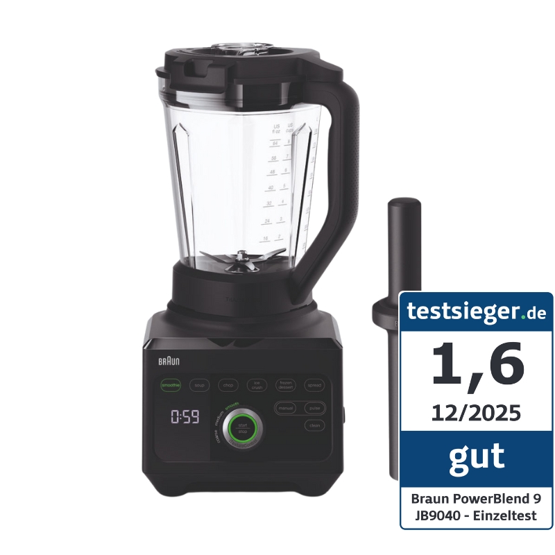 "Der Braun PowerBlend 9 JB 9040 ist ein verlässlicher Standmixer, der viele Aufgaben souverän meistert. Er überzeugt durch ein modernes Design, eine wertige Verarbeitung und eine intuitive Bedienung mit vielen Programmen. Bei Smoothies liefert er hervorragende Resultate, während Crushed Ice und Sorbets solide, wenn auch nicht perfekte Ergebnisse erzielen. Die Reinigung gestaltet sich dank spülmaschinengeeigneter Teile und Clean-Modus unkompliziert, einzig die hohe Lautstärke fällt im Alltag etwas negativ auf."