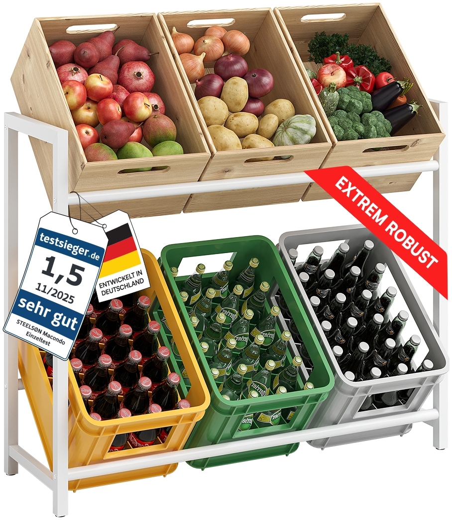 "Das STEELSØN Macondo Getränkekistenregal überzeugt im Test durch eine stabile Bauweise, eine einfache Montage und eine durchdachte Funktionalität. Die Pulverbeschichtung schützt das Material zuverlässig, der Aufbau gelingt schnell und ohne zusätzliche Werkzeuge. Im Alltag funktioniert das Regal reibungslos, die Ergonomie passt, und auch die Belastbarkeit unter Volllast spricht für die Qualität der Konstruktion.