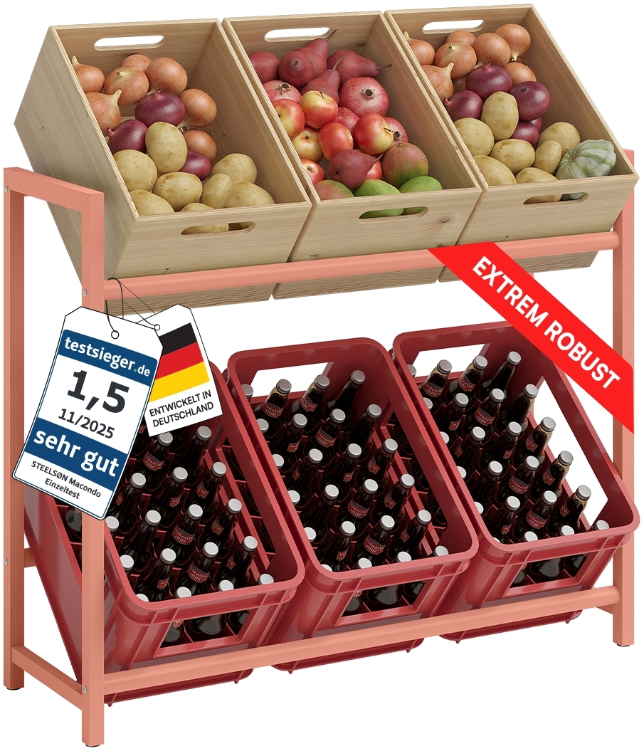 "Das STEELSØN Macondo Getränkekistenregal überzeugt im Test durch eine stabile Bauweise, eine einfache Montage und eine durchdachte Funktionalität. Die Pulverbeschichtung schützt das Material zuverlässig, der Aufbau gelingt schnell und ohne zusätzliche Werkzeuge. Im Alltag funktioniert das Regal reibungslos, die Ergonomie passt, und auch die Belastbarkeit unter Volllast spricht für die Qualität der Konstruktion.