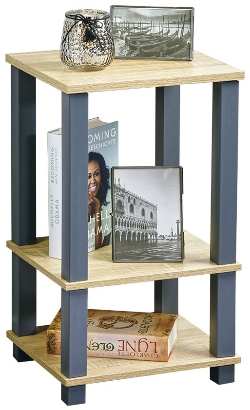 Regal mit 3 Ebenen. Ordnungshelfer für alle Wohnbereiche. Ideal für Bücher und Deko. FSC®-zertifizierte Spanplatte (Lizenznummer FSC-C014021). Farbe: Eichendekor, grau. Inkl. 1 Wandbefestigung. Maße (L x B x H): 34 x 58,5 x 29 cm.