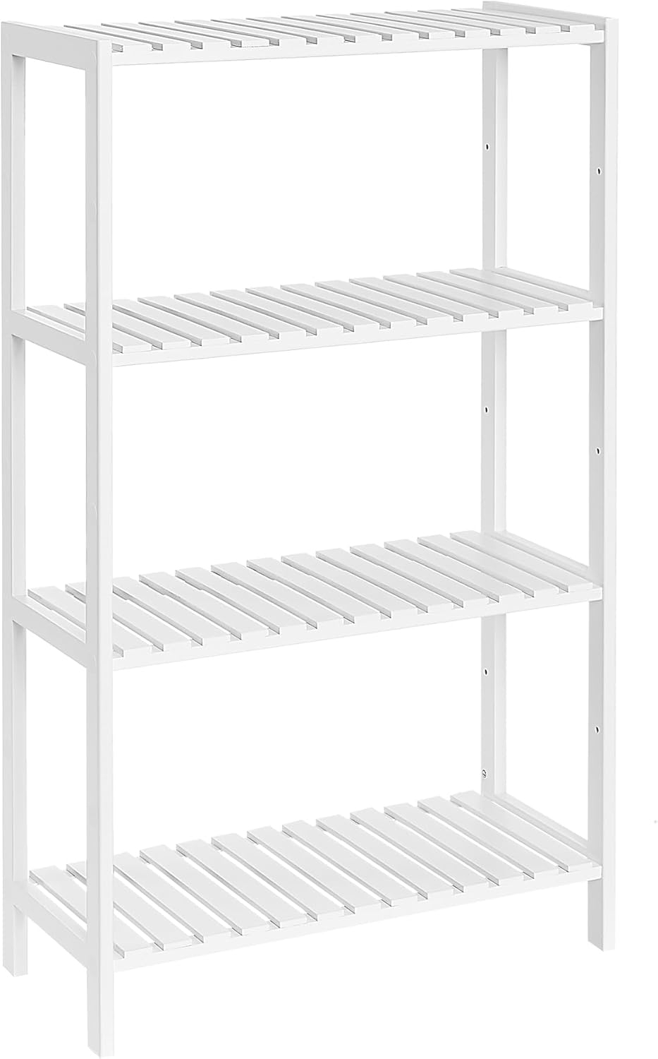 Praktisches Badezimmerregal aus robustem Bambus in Weiß, ideal zur Aufbewahrung und Organisation. Mit den Maßen 26 x 60 x 100 cm bietet es vier Ablagen, die jeweils bis zu 10 kg tragen können. Das Regal ist vielseitig einsetzbar, sei es im Badezimmer, Flur oder auf dem Balkon. Der einfache Aufbau ermöglicht eine schnelle Montage, während die pflegeleichte Oberfläche die Reinigung erleichtert. **Highlights** - Aus robustem Bambus gefertigt für hohe Stabilität - Max. statische Belastbarkeit je Ablage: 10 kg - Vielseitig einsetzbar in verschiedenen Räumen - Einfacher Aufbau ohne Expertenwissen - Pflegeleichte Oberfläche für einfache Reinigung **Produkteigenschaften** - Farbe: Weiß - Material: Bambus - Maße (T x B x H): 26 x 60 x 100 cm - Gewicht: 4,7 kg - 4 Ablagen **Lieferumfang** - 1 x Bambusregal mit 4 Ebenen - 1 x Kippschutz - 1 x Zubehörpaket - 1 x Anleitung
