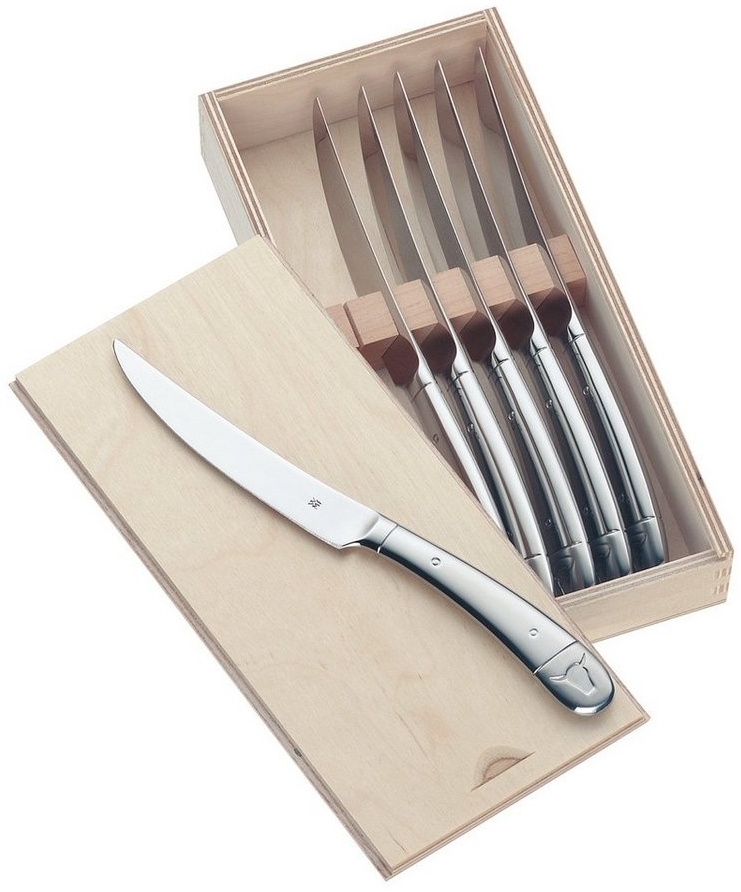 Das WMF Steakmesser-Set 6-tlg. Nuova ist ideal für Steakliebhaber. Mit scharfen Klingen aus Spezialklingenstahl und Wellenschliff schneiden die Messer mühelos durch Gegrilltes und dickes Fleisch. Die extralangen Zinken der Gabel ermöglichen ein einfaches Aufspießen von Fleischstücken. Hergestellt aus hochwertigem Cromargan® ist das Set spülmaschinenfest und wird in einer eleganten Holzkiste geliefert. **Highlights** - Klinge aus Spezialklingenstahl mit Wellenschliff für kraftvolles Schneiden - Extralange und spitze Zinken der Steakbesteck-Gabel für einfaches Aufspießen - Cromargan®-Material für Langlebigkeit und Hygiene - Spülmaschinenfest für eine einfache Reinigung - Lieferung in hochwertiger Holzkiste **Produkteigenschaften** - Material: Cromargan Edelstahl 18/10 poliert - Rostfrei, spülmaschinengeeignet, formstabil, hygienisch, säurefest und unverwüstlich - Messerart: Geschmiedete Messer - Länge: 23 cm - Farbe: Edelstahl - Designer: Köhler & Wilms **Lieferumfang** - 6x Steakmesser in hochwertiger Holzkiste