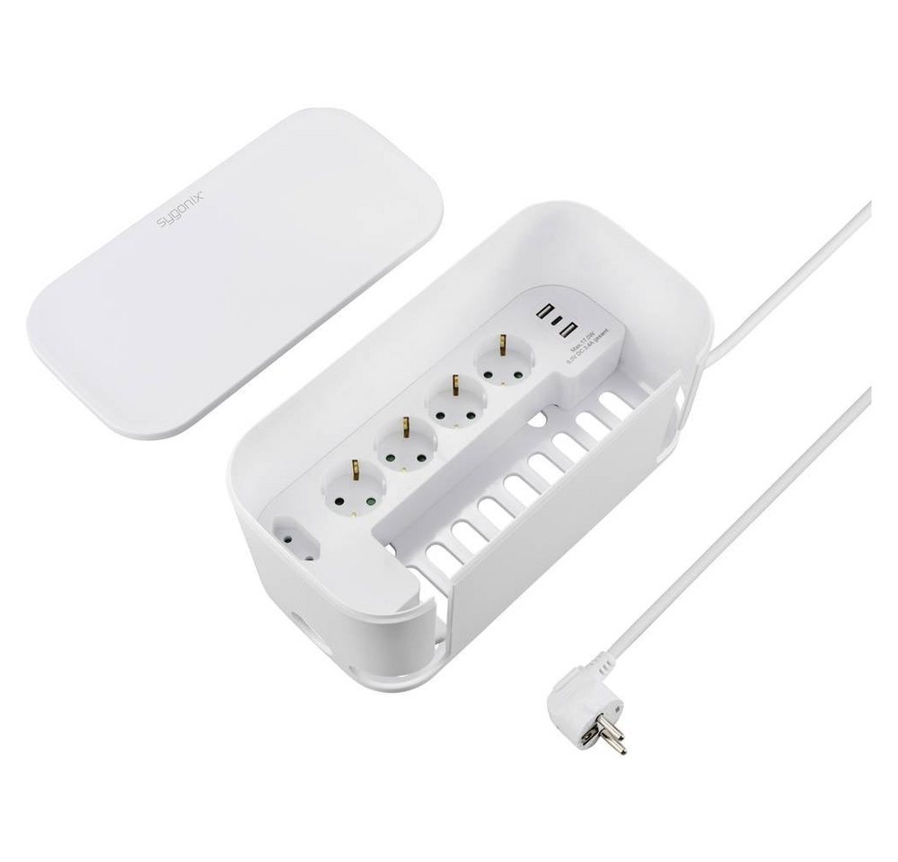 • Die Sygonix Kabelbox WS bietet eine praktische 5-fach Steckdosenleiste mit vier Schutzkontaktsteckdosen und einer Euro-Steckdose für AC-Geräte