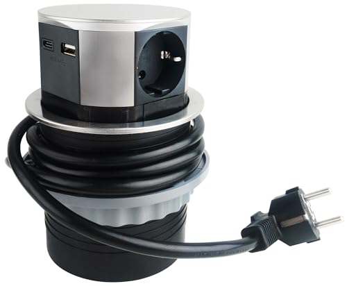 ChiliTec Versenkbare Einbausteckdose 3X Steckdose USB-A USB-C Edelstahl Front Mehrfachsteckdose mit 150cm Kabel 230V für KücheSchreibtisch, Arbeitsplatten