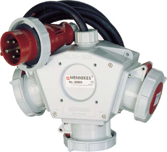 • Die Mennekes DELTA-BOX 92909 ist eine anschlussfertige Steckdose mit einem Gehäuse aus Polycarbonat in elektrograu