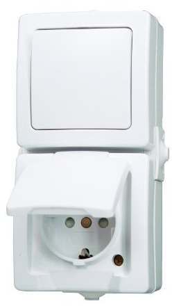 Kombination aus Steckdose und Schalter für Feuchträume, bietet erhöhten Berührungsschutz.