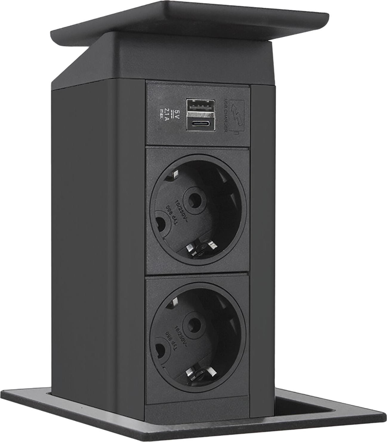 • Die Steckdosenleiste ist für Platten mit 10 bis 50 mm Stärke geeignet und verfügt über 2 Schukosteckdosen sowie einen USB-A- und einen USB-C-Charger.