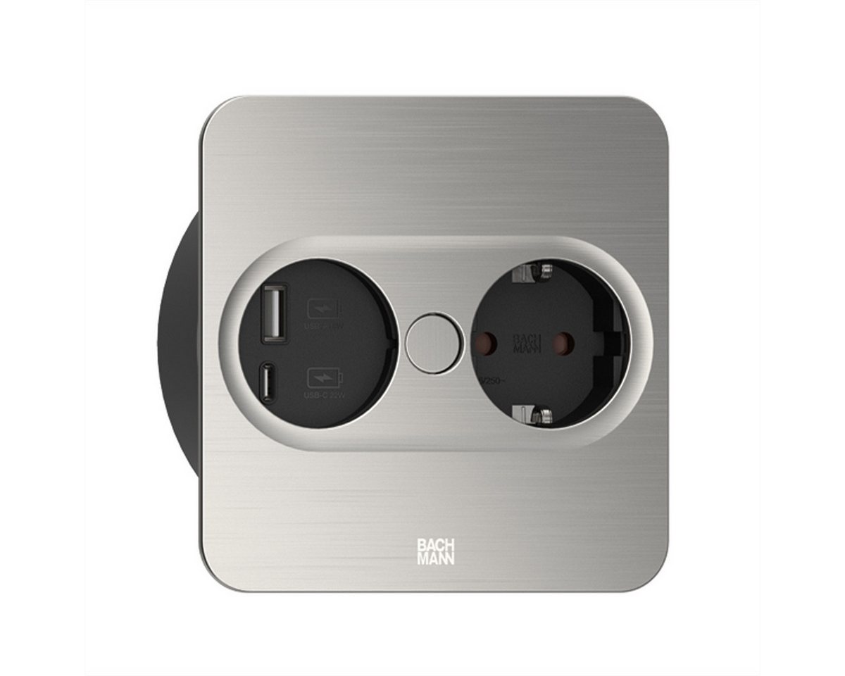 • Die Bachmann TWIST 2 Einbau-Tischsteckdosenleiste in Edelstahl-Optik bietet eine Schutzkontaktsteckdose mit erhöhtem Berührungsschutz sowie einen 22W USB A/C Charger